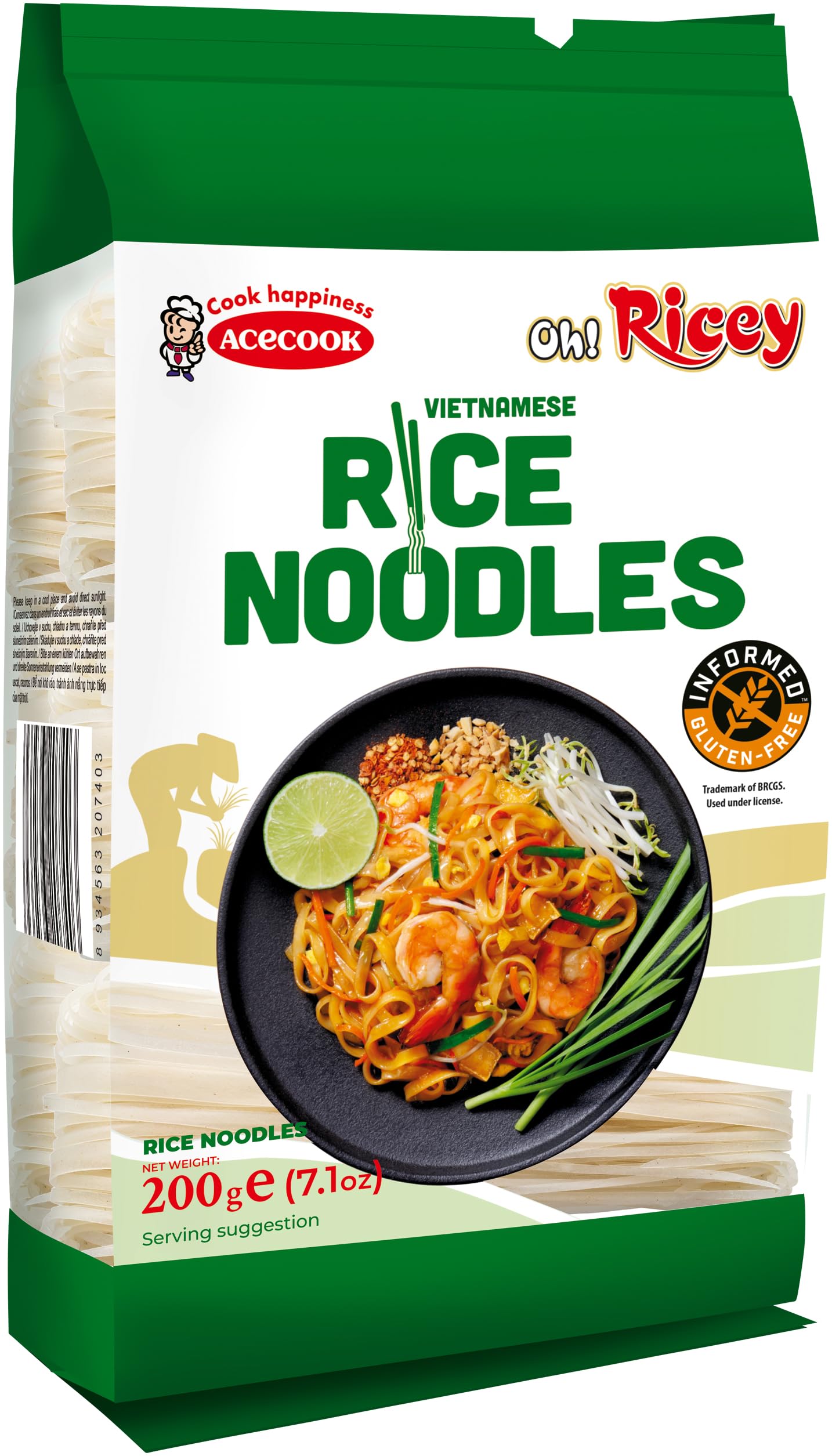 Golden rice noodles, contents: 1 x 200g. Premium quality, from Vietnam. Brand: acecook. INGREDIENTS Rice 95 , thickener: E1404, salt, emulsifiers: E466, E322 (soy lecithin). COOKING INSTRUCTIONS Boil in water for 2-3 minutes. SAFETY WARNING No warning See more
