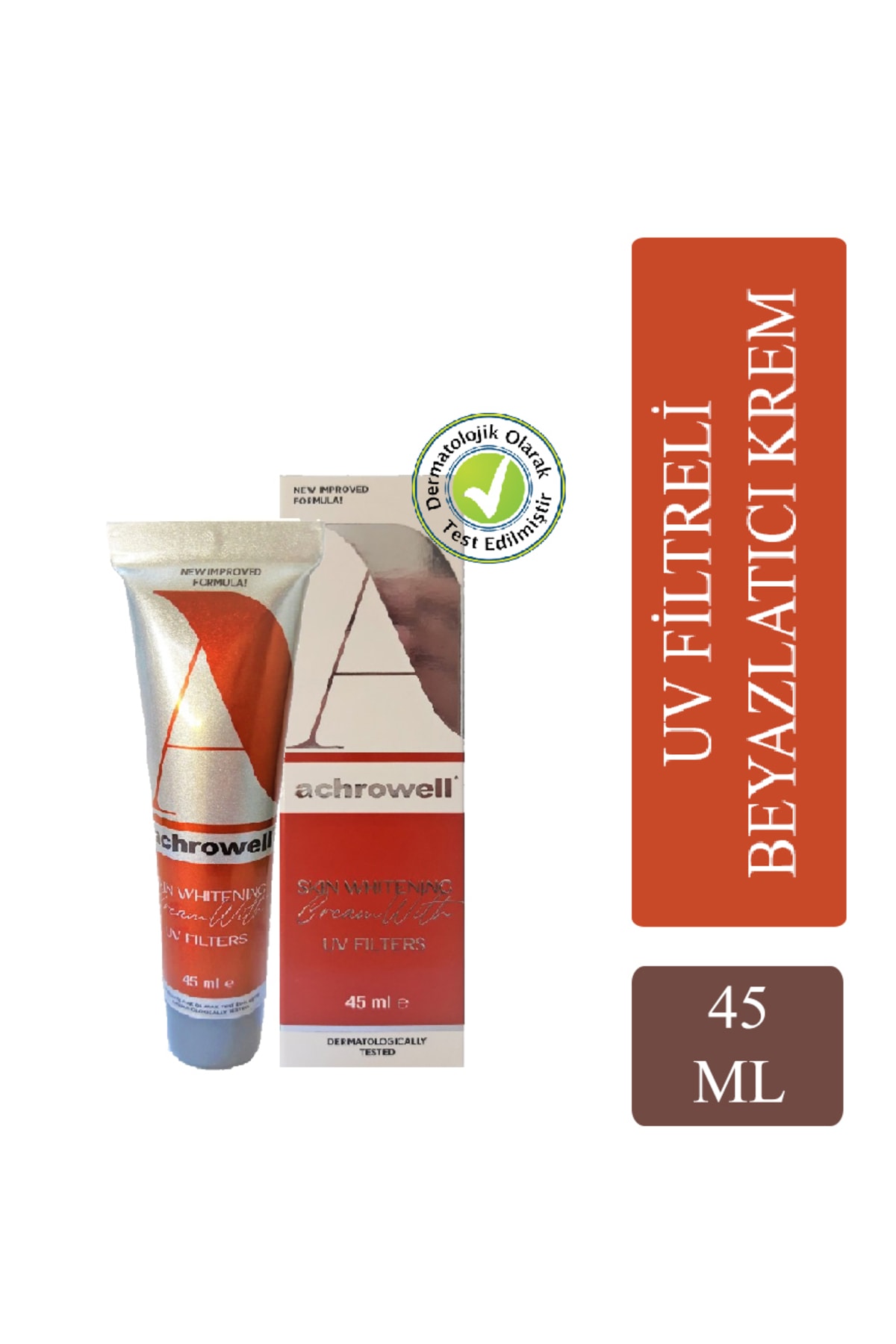 Achrowell UV Filtreli Beyazlatici Krem, Yenilikçi formül ve içerigindeki özenle seçilmis zengin bilesenler olan B3 vitamini, E vitamini ve UV filtreleri ile cildin ihtiyaç duydugu bakimi sunar.Pürüzsüz bir dokuya ve hassa bir kokuya sahip olan beyazlatici krem daha beyaz ve aydinlik bir ten için vazgeçilmeziniz olacaktir.Günesin zararli isinlarina karsi koruyucu özelligi ve düzenli kullanim ile cildiniz artik daha aydinlik, nemli ve pürüzsüz.