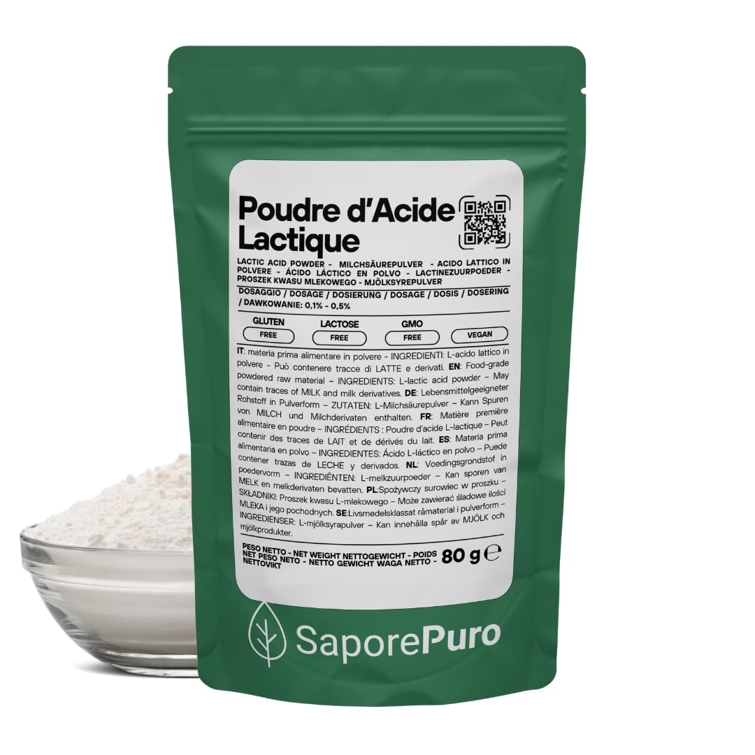 Acide Lactique en Poudre 80 g – Qualité Alimentaire Pure – Pour Boulangerie, Produits Laitiers, Boissons Fermentées et Usage Cosmétique