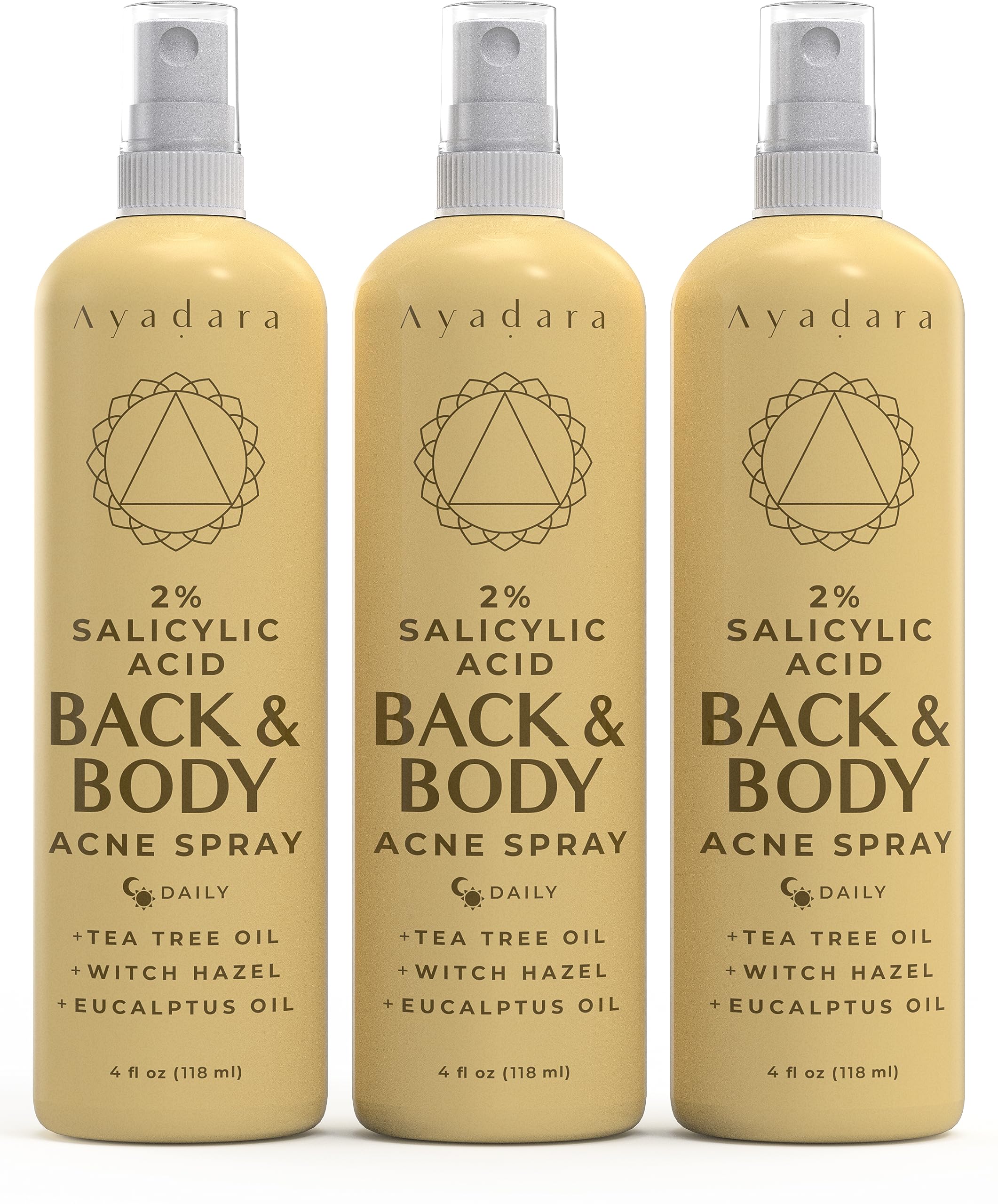 Simple Application and Usage Instructions: Spray our salicylic acid spray over acne-prone areas, allowing it to dry without rinsing. Use as often as desired for ongoing acne management. For a complete skincare routine, pair it with our Severe Acne Charcoal Face Wash, providing a dual-action approach to drying out acne while hydrating your skin. Portable and Convenient Acne Care: Take control of hard-to-reach imperfections on the go with our portable and convenient acne body spray. Packaged in a 3-pack bundle, this mist makes it easy to target acne wherever it appears, ensuring a hassle-free skincare routine. FSA HSA Eligible (Approved): Clear the way for radiant skin with our backne spray. This formula regulates sebum and provides gentle exfoliation and moisturization, offering comprehensive skincare benefits in one easy-to-use body acne spray. Versatile Body Acne : Target acne on various body areas, including the chest, shoulders, butt, thighs, and back with our acne spray. Thanks to this back acne spray's versatility, you can achieve smoother and flawless skin anytime. Quick Drying Acne Defense: Swiftly absorb your skin with just one spritz of our acne back spray. Powered by active salicylic acid and tea tree oil, it clears blocked pores, reduces redness, and alleviates itching for a rapid and effective acne-fighting experience. Triple-Pack Back Body Acne Solution: Experience the convenience of Ayadara 3-pack back acne spray, ensuring a consistent and effective solution for managing and preventing acne on your back.