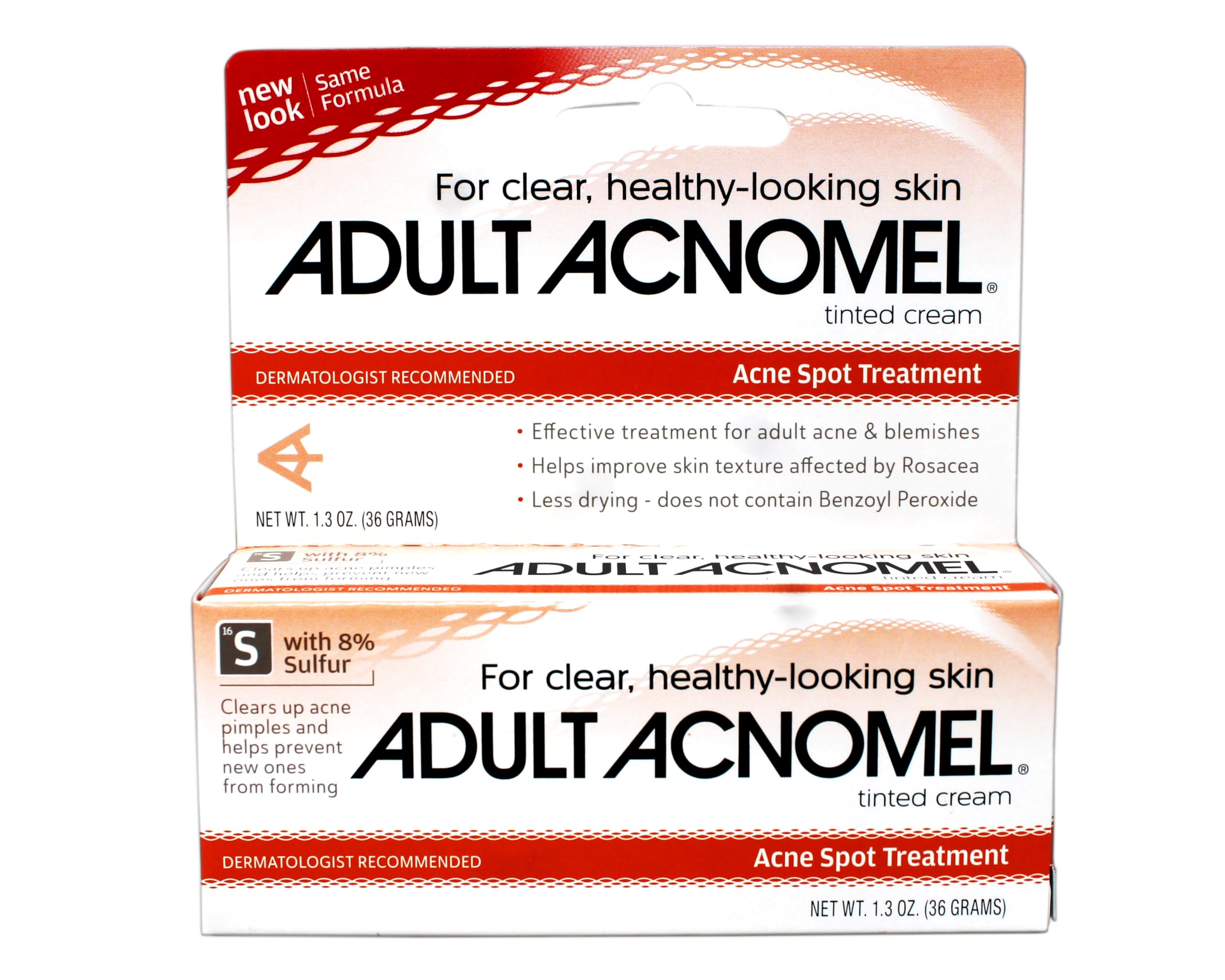 Adult Acnomel adult medication tinted cream clears up pimples and helps prevent new ones from forming. It is an effective treatment of adult blemishes. Helps improve skin texture affected by Rosacea. Less drying does not contain Benzoyl Peroxide.