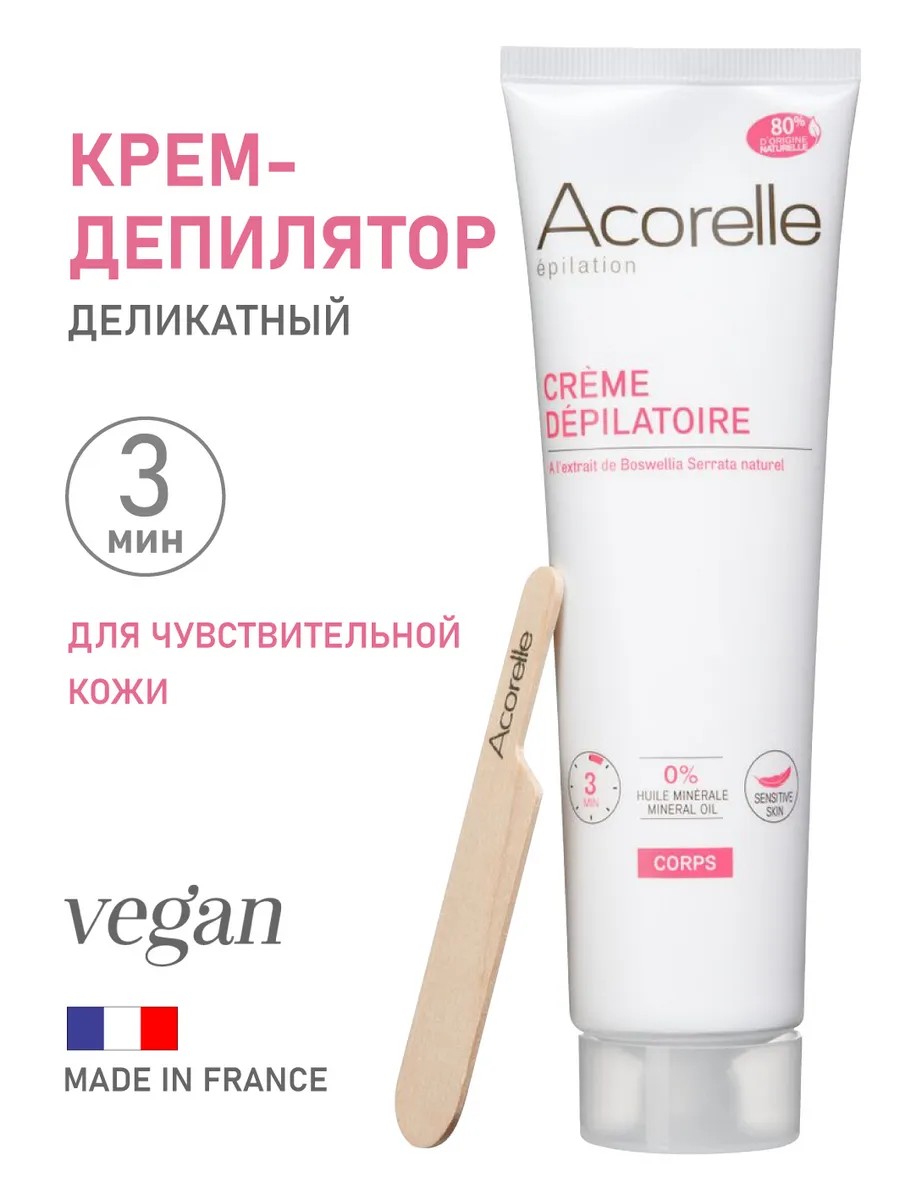 Лаборатория Acorelle создала натуральную формулу, которая мягко и деликатно воздействует на чувствительную кожу. Не содержит минеральных масел и парабенов. Благодаря экстракту босвеллии крем для депиляции лица и деликатных зон предотвращает покраснение и раздражение кожи. Эффективно, быстро и безболезненно!Быстрое удаление волос без боли.Формула, которая эффективно удаляет волосы даже за 3 минуты без боли. Кремовая текстура позволяет легко распределить средство по телу и оставляет кожу гладкой и нежной.Рецептура крема для депиляции Acorelle была разработана специально, чтобы предложить альтернативу традиционным кремам для депиляции. На 80% состоит из натурального сырья, полностью безопасная формула. Экстракт босвеллии успокаивает кожу, снимает раздражение и покраснение.Средство обладает нежным цветочным ароматом, разработанным парфюмером Acorelle для того, чтобы процедура депиляции была приятнее!