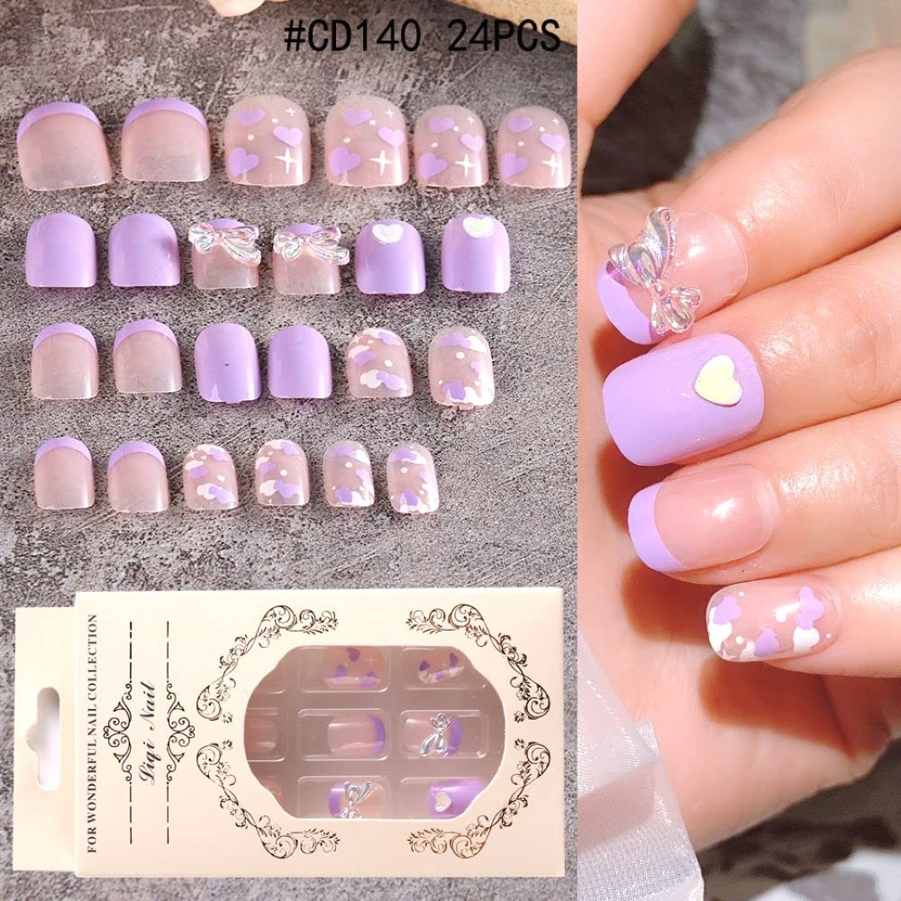 Acrylic Press On Nail Art Tips with Jelly Stickers Fake Nails Love Heart Short Square Pink Purple(CD140)