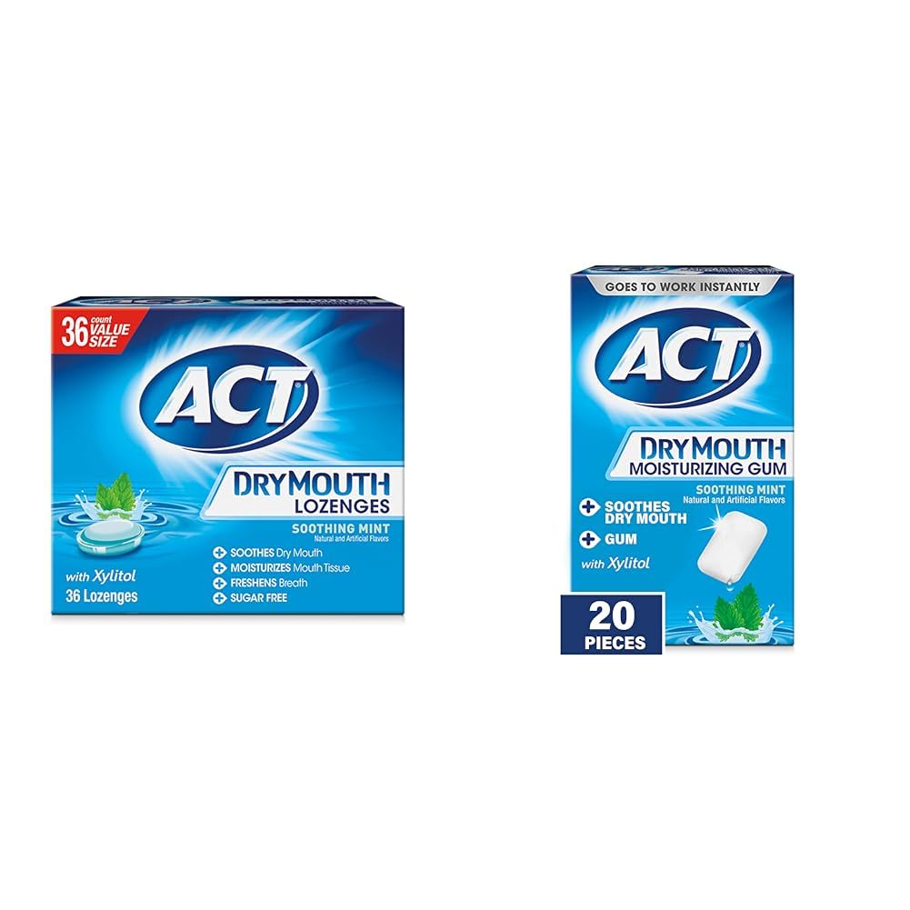 ACT Dry Mouth Lozenges with Xylitol, Soothing Mint, 36 Lozenges Did you know that dry mouth affects 10 of all adults and 25 of those over the age of 65? Soothe dry mouth anytime, anywhere with convenient ACT Dry Mouth Lozenges in Sugar Free Soothing Mint flavor. These lozenges for dry mouth are specially formulated with xylitol to help soothe dry mouth, moisturize mouth tissue, and freshen breath. Best of all, they are easy to bring on the go. Keep a 36-piece pack in your purse, briefcase or backpack to fight dry mouth when you need it most. For variety, also try ACT Dry Mouth Lozenges in Sugar Free Honey-Lemon flavor. When it comes to your dental health, you're in it for the long haul. Turn to the No. 1 dentist recommended cavity protection brand as part of an oral care routine and long live your teeth. Douglas, L.M. Managing Xerostomia. Vital 6, 32-34 (1 March 2009), doi: 10.1038 vital944 Among OTC mouth rinses ACT Dry Mouth Moisturizing Gum, 20 Pieces, With Xylitol, Sugar Free Soothing Mint Soothe dry mouth anytime, anywhere with ACT Dry Mouth Moisturizing Gum. This sugar-free gum is formulated with a Soothing Mint flavor and xylitol to soothe dry mouth, freshen breath, and stimulate saliva flow. Get relief from dry mouth with the soothing mint flavor. Best of all, this dry mouth gum is easy to bring on the go. Keep a 20-count pack in your purse, briefcase or backpack to soothe dry mouth anytime, anywhere. Also try ACT Dry Mouth Lozenges for more soothing relief when you're on the go.Product 2: CONVENIENT SIZE: Use this dry mouth gum to soothe dry mouth on the go, anytime, anywhere. Product 2: 3 BENEFITS IN 1: ACT Gum for Dry Mouth soothes dry mouth, moisturizes mouth tissue and freshens breath. Product 2: FORMULATED WITH XYLITOL: ACT Gum for Dry Mouth features xylitol to soothe dry mouth. Product 2: Contains one (1) 20-count pack of ACT Dry Mouth Moisturizing Gum With Xylitol, Sugar Free Soothing Mint. Product 1: Convenient Relief: Take with you for dry mouth relief anytime, anywhere. Product 1: Benefits: Soothes dry mouth, moisturizes mouth tissue and freshens breath. Product 1: Sugar-free Lozenges: ACT Dry Mouth Lozenges do not contain fluoride. Product 1: What You'll Get: One (1) box of 36 Dry Mouth Lozenges with Xylitol, Soothing Mint Flavor.