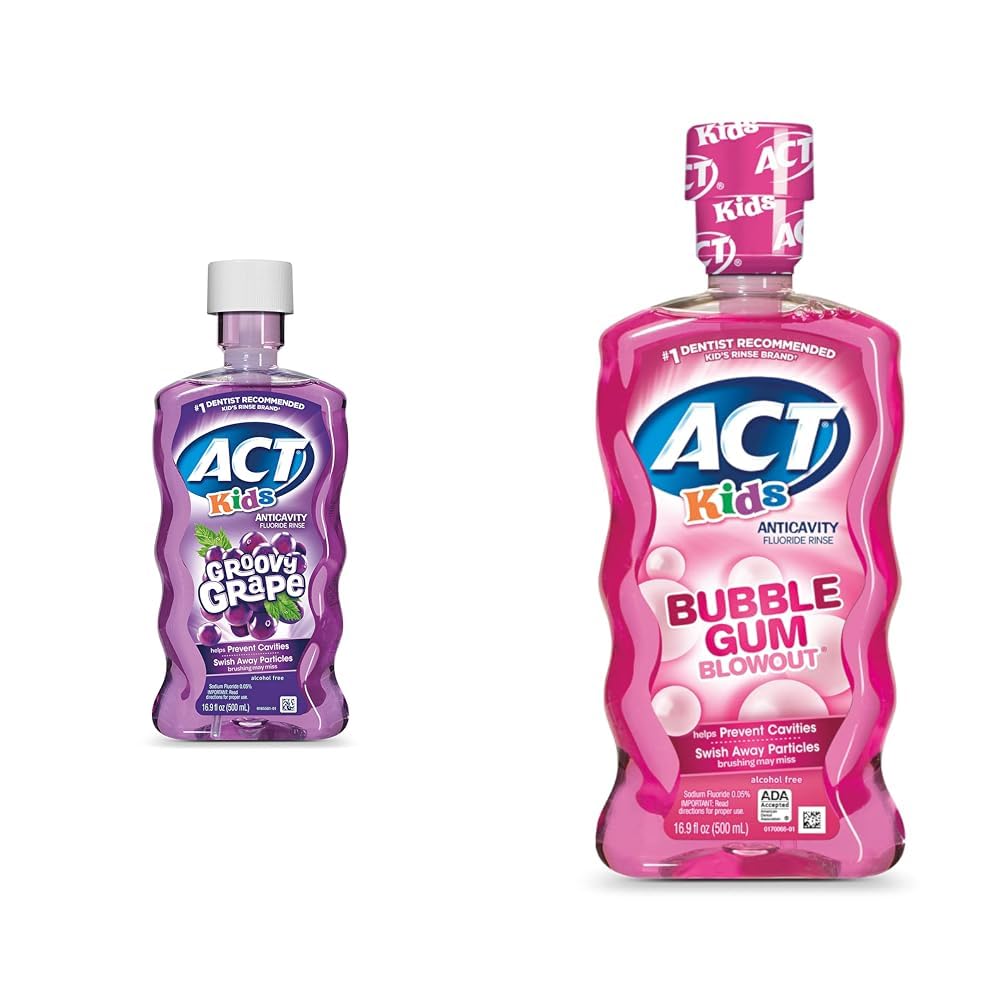 This bundle includes two 16.9 fl. oz. bottles of ACT Kids Anticavity Fluoride Rinse to help prevent cavities and strengthen teeth. One bottle is Groovy Grape flavor and comes with an accurate dosing cup. It contains the maximum strength fluoride available without a prescription. The second bottle is Bubble Gum Blowout flavor. Both rinses are alcohol-free and formulated to improve kids' oral hygiene. The Groovy Grape rinse helps prevent up to 40 of future cavities. Its accurate dosing cup provides the right fluoride dose to strengthen teeth. The Bubble Gum rinse also prevents cavities while providing a fun flavor kids love. Using both rinses provides complete oral care - fighting cavities, strengthening teeth, and freshening breath. Trust ACT, the 1 dentist recommended kids' brand. When used together, these two flavors complement a complete oral health routine for kids. Their anticavity protection and accurate dosing give parents assurance while the kid-friendly flavors motivate proper dental hygiene habits.
