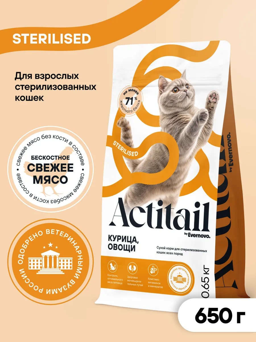 Правильное питание — это залог здоровья и долголетия для стерилизованной кошки! Натуральный сухой корм Actitail — это полнорационный, идеально сбалансированный состав класса супер-премиум, содержащий свежее мясо курицы, овощи, а также витамины, микроэлементы и клетчатку. Рацион без синтетических ароматизаторов, усилителей вкуса и ГМО также подходит для питомцев с чувствительным пищеварением. Он произведен в соответствии с российским ГОСТом и нормами по кормам FEDIAF, NRC. Продукт с высоким содержанием животного белка (71%) включает 43% отборного мяса курицы. Он отличается низким количеством жира, благодаря чему помогает поддерживать оптимальный вес стерилизованного или кастрированного домашнего животного. Также в составе пониженное содержание кальция, фосфора и магния, что необходимо для профилактики мочекаменной болезни. Баланс разных видов клетчатки мягко стимулирует работу желудочно-кишечного тракта, помогая выводить шерсть.