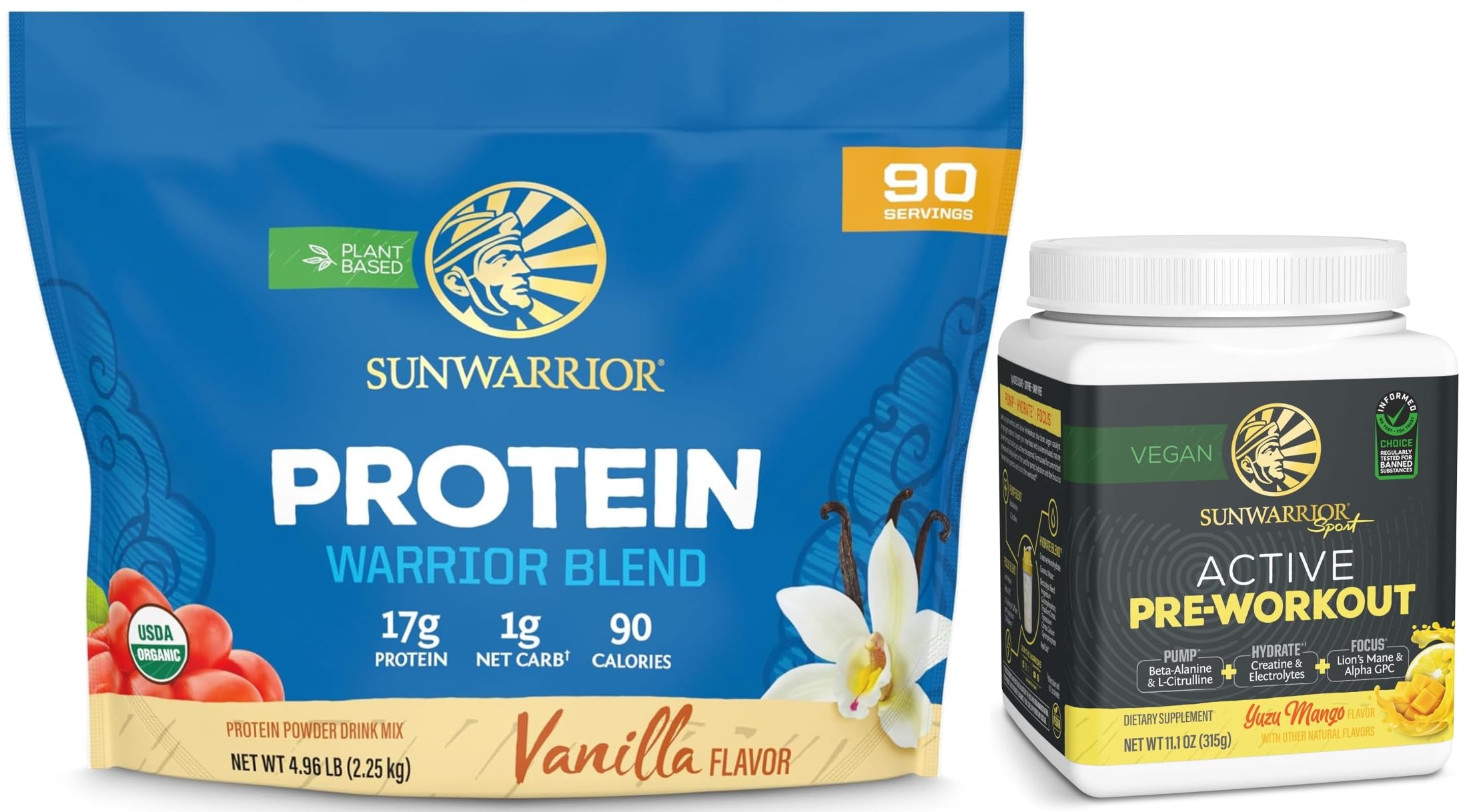 Active Preworkout Hydration Blend & Vanilla Organic Plant Based Protein Powder Set | Bundle & Save | Non-GMO Soy Dairy Filler & Gluten Free (90 Servings Protein 30 Servings Yuzu Mango Pre Workout)