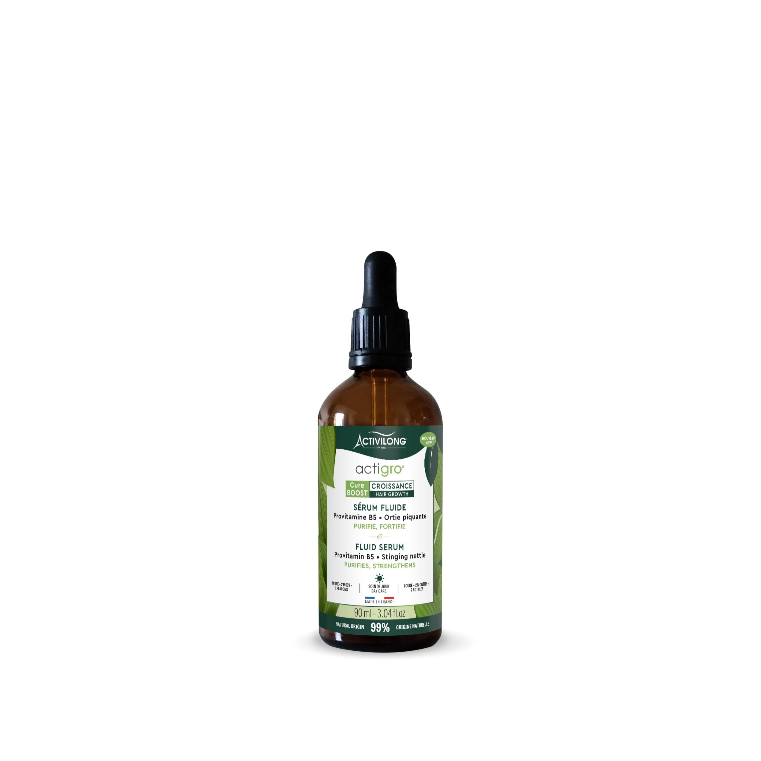 Discover the power of the Actigro range! Take care of your textured hair with the Actigro range, a hair care treatment designed to specifically address the challenges of brittle, split ends and hair prone to loss. Treat yourself to an expert ritual with two adapted treatments: the Stop Cure to counteract hair loss and breakage, and the Boost Cure to stimulate active hair growth, day and night. INGREDIENTS Propylene Glycol, Glycerin, Panthenol, Maltodextrin, Camphor, Menthol, Hydrolyzed Wheat Protein, Citrus Aurantium Dulcis (Orange) Peel Oil, Limonene, Ptychopetalum Olacoides Bark Extract, Urtica Dioica (Nettle) Leaf Extract, Aqua (Water), Rosmarinus Officinalis (Rosemary) Leaf Stem Oil, Panax Ginseng Root Extract, Melaleuca Alternifolia (Tea Tree) Leaf Oil, Pimenta Racemosa (Bay) Leaf Fruit Oil, Zingiber Officinale (Ginger) Root Oil, Eugenol, Linalool, Citral, Citric Acid, Geraniol. The formulations of our products are potentially subject to change, we recommend that you check the list of ingredients indicated directly on the back of the product. DIRECTIONS FOR USE 1. Apply Actigro Fluid Serum to your scalp and hair daily. 2. Distribute it evenly by massaging gently. 3. Do not rinse, as it penetrates quickly without leaving greasy residue. 4. Use it regularly to promote healthy hair growth and prevent hair loss. SAFETY WARNING Not suitable for pregnant or breastfeeding women (presence of essential oils) Stimulates and invigorates your scalp. Discover our Fluid Serum, a unique formulation that combines nature and science to revitalize your hair and purify your scalp. Enriched with provitamin B5, tea tree essential oil, and organic stinging nettle extract, this serum is your daily ally to promote healthy hair growth. Ideal for daily use, its lightweight texture is non-greasy and absorbs quickly, leaving your hair soft, moisturized, and full of life. Use it regularly to prevent hair loss and maintain thick, strong hair. Découvrez la puissance de la gamme Actigro ! Prenez soin de vos cheveux texturés avec la gamme Actigro, une cure de soins capillaires conçue pour répondre spécifiquement aux défis des cheveux cassants, fourchus et sujets à la chute. Offrez-vous un rituel expert avec deux cures adaptées : la Cure Stop pour contrer la chute et la casse, et la Cure Boost pour stimuler la croissance active des cheveux, jour et nuit. INGRÉDIENTS Propylene Glycol, Glycerin, Panthenol, Maltodextrin, Camphor, Menthol, Hydrolyzed Wheat Protein, Citrus Aurantium Dulcis (Orange) Peel Oil, Limonene, Ptychopetalum Olacoides Bark Extract, Urtica Dioica (Nettle) Leaf Extract, Aqua (Water), Rosmarinus Officinalis (Rosemary) Leaf Stem Oil, Panax Ginseng Root Extract, Melaleuca Alternifolia (Tea Tree) Leaf Oil, Pimenta Racemosa (Bay) Leaf Fruit Oil, Zingiber Officinale (Ginger) Root Oil, Eugenol, Linalool, Citral, Citric Acid, Geraniol. Les formulations de nos produits sont potentiellement sujet à des évolutions, nous vous recommandons de vérifier la liste des ingrédients indiquée directement au dos du produit. MODE D'EMPLOI 1. Appliquez le Sérum Fluide Actigro sur votre cuir chevelu et vos cheveux quotidiennement. 2. Répartissez-le uniformément en massant délicatement. 3. Ne rincez pas, car il pénètre rapidement sans laisser de résidus gras. 4. Utilisez-le régulièrement pour favoriser une croissance saine des cheveux et prévenir la chute. AVERTISSEMENT DE SÛRETÉ Ne convient pas aux femmes enceintes ou allaitantes (présence d'huiles essentielles) Stimule et tonifie votre cuir chevelu. Découvrez notre Sérum Fluide, une formulation unique qui allie la nature à la science pour revitaliser vos cheveux et purifier votre cuir chevelu. Enrichi en provitamine B5, en huile essentielle de tea tree, et en extrait d'ortie piquante bio, ce sérum est votre allié quotidien pour favoriser une croissance saine des cheveux. Idéal pour une utilisation quotidienne, sa texture légère ne graisse pas les cheveux et pénètre rapidement, laissant vos cheveux doux, hydratés et pleins de vie. Utilisez-le régulièrement pour prévenir la chute des cheveux et maintenir une chevelure dense et forte.