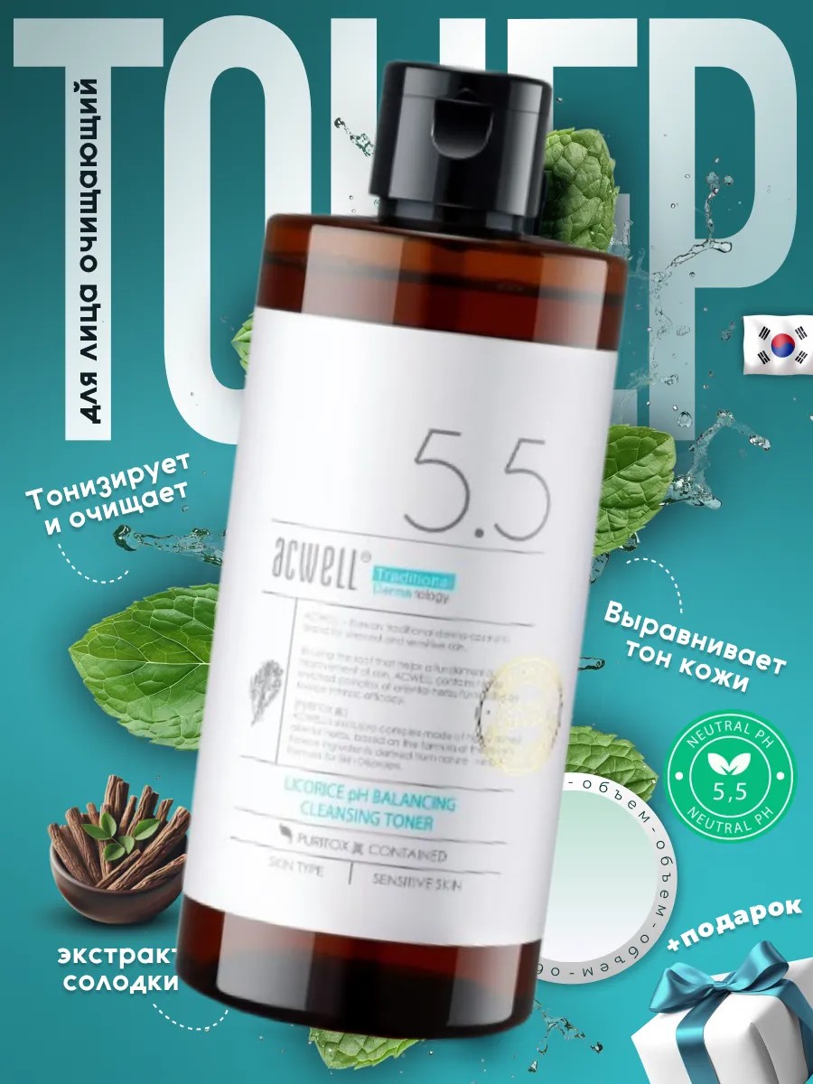| Комплектация | Слабокислотный очищающий тонер с экстрактом солодки ACWELL Licorice PH Balancing Cleansing Toner |