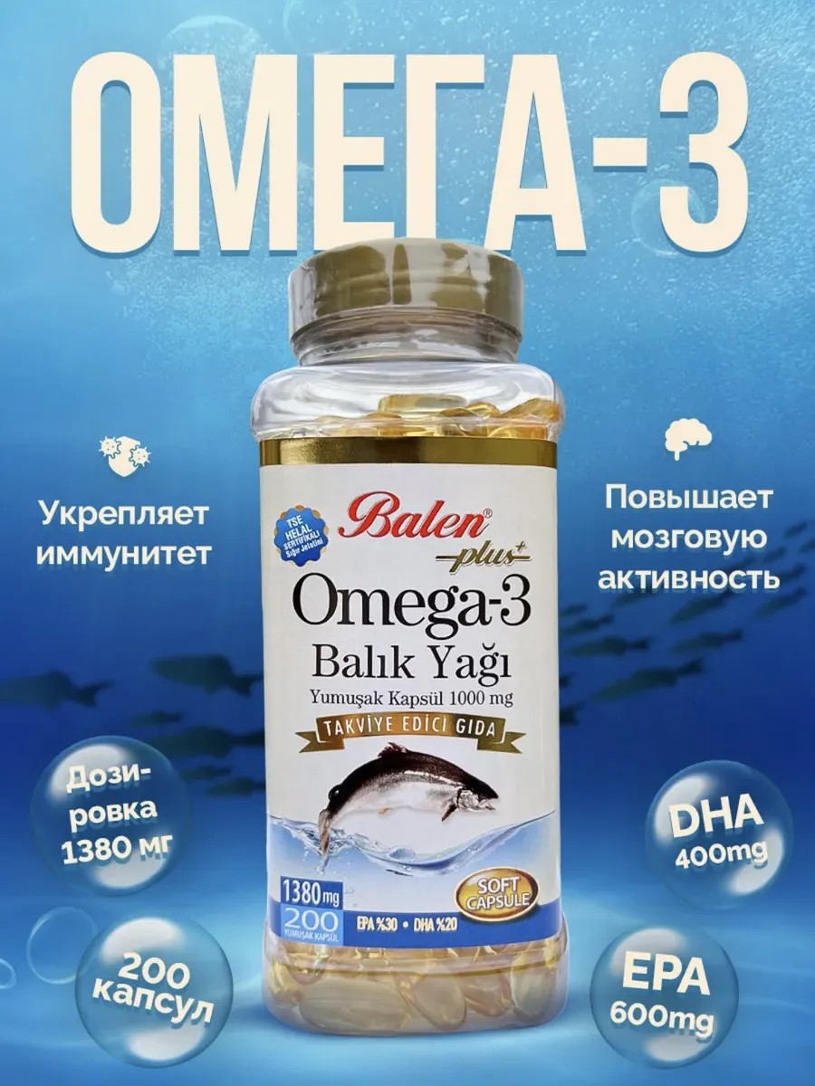 Традиционное норвежское качество для вашего здоровья Рыбий жир – кладезь полезных веществ для организма. Он необходим не только детскому растущему организму, но и взрослым. Эта полиненасыщенная жирная кислота каждый день решает массу важных задач, от которых зависит наше самочувствие и долголетие: Поддержание эластичности клеток (молодость и красота). Защита мембран клеток от повреждений. Активное участие в синтезе половых гормонов. Поддержка теплообменных процессов в организме. Поддержание и пополнение энергетических запасов. Незаменимая поддержка в усвоении жирорастворимых витаминов, в число которых входят A, D, K. Нужно помнить, что человеческий мозг состоит на 60% их жировых тканей, поэтому для его работы нужны липиды, и прием жиров становится необходимостью. Омега 3 представляет особую ценность для нашего организма, так как это полиненасыщенные жирные кислоты, которые, в свою очередь, имеют 3 составляющие: 1. Альфа-линолевая кислота. 2. Докозагексаеновая кислота. 3. Эйкозапентаеновая кислота. Они – настоящее сокровище, так как Омега-3 не вырабатывается самостоятельно организмом и может поступать исключительно с пищей. Не нужно говорить о том, что в 99% рацион современного человека очень далек от идеала, особенно, если у людей есть какие-то ограничения в питании. Это значит, что нужно в обязательном порядке рассмотреть вопрос о приеме Омега-3 в виде пищевой качественной добавки, коей и является продукт от известнейшего и авторитетного по всему миру производителя Balen! Он имеет массу полезных свойств и качеств, которые вы оцените по достоинству: Общеукрепляющий эффект для иммунитета. Доказанный иммуностимулятор. Антиокислительное средство. Регулирование показателей артериального давления и приведение его в норму. Разжижающий и антитромбоцитарный эффект. Поддержка при восстановлении жирового обмена. Стабилизация клеточных мембран. Замечательное противовоспалительное средство. Позитивное влияние на процессы холестеринового обмена. Нормализация тока крови. Если вы можете найти у себя хоть один признак из перечисленных ниже, советуем вам оформить заказ Омега-3: 1. Низкий иммунитет. 2. Сбои в нервно-психологическом фоне. 3. Набор веса и трудное похудение. 4. Вялое и затяжное течение болезней. 5. Сухость кожи, которая становится патологической. 6. Гипертония. 7. Нарушения в функционировании кровеносной системы. 8. Хвори глаз. 9. Аллергия. 10. Проблемы со сном, раздражительность, стресс и сбои в памяти. Рыбий жир Balen от известного турецкого бренда в капсулах позволит быстро оставить многие проблемы со здоровьем в прошлом и чувствовать себя замечательно.