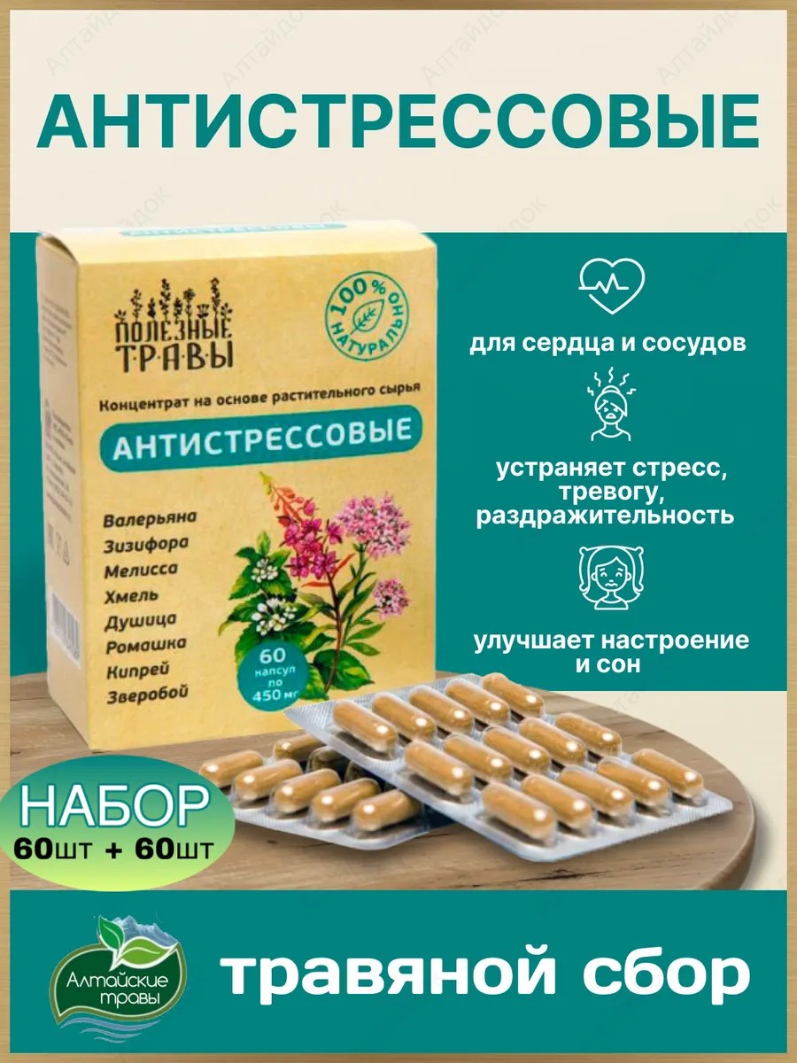 Травяной сбор антистресс на Алтайских травах благоприятно воздействует на нервную систему. Эффективно восстанавливает психоэмоциональное равновесие. Устраняет беспокойство и бесконтрольное волнение. Снимает тревожность, эмоциональное напряжение, от бессонницы, от стресса. Он удобен в использование, не требует много времени. Нормализует деятельность сердечно-сосудистой системы. Помогает снижению артериального давления и нормализации сердечного ритма. Входящие в состав траы, влияют на устранение головной боли. Применяется при вегетососудистой дистонии. Антидепрессанты на основе растений мягко оберегают от перепадов настроения, беспричинных слез, агрессивности мужчин и женщин. Усиливает стрессоустойчивость. Благоприятствует более быстрому восстановлению после перевозбуждения. Помогает справиться с перегрузками. Концентрат улучшает самочувствие и энергетический потенциал. Полезны при упадке сил и депрессиях. Снотворное в таблетках обладает мягким успокаивающим действием. Налаживает сон, ускоряет процесс засыпания. Способствует устранению ночных пробуждений. Натуральное средство рекомендовано при состоянии стресса, раздражительности, переутомлении. Кардионеврозах, психосоматических расстройствах ЦНС и вегетативной нервной системы, в климактерический период. Витаминный комплекс уменьшает возбудимость центральной нервной системы, укрепляет и повышает её функциональность. Способ применения: по 1 капсуле 3 раза в день во время приема пищи. Ваши нервы под надежной защитой!