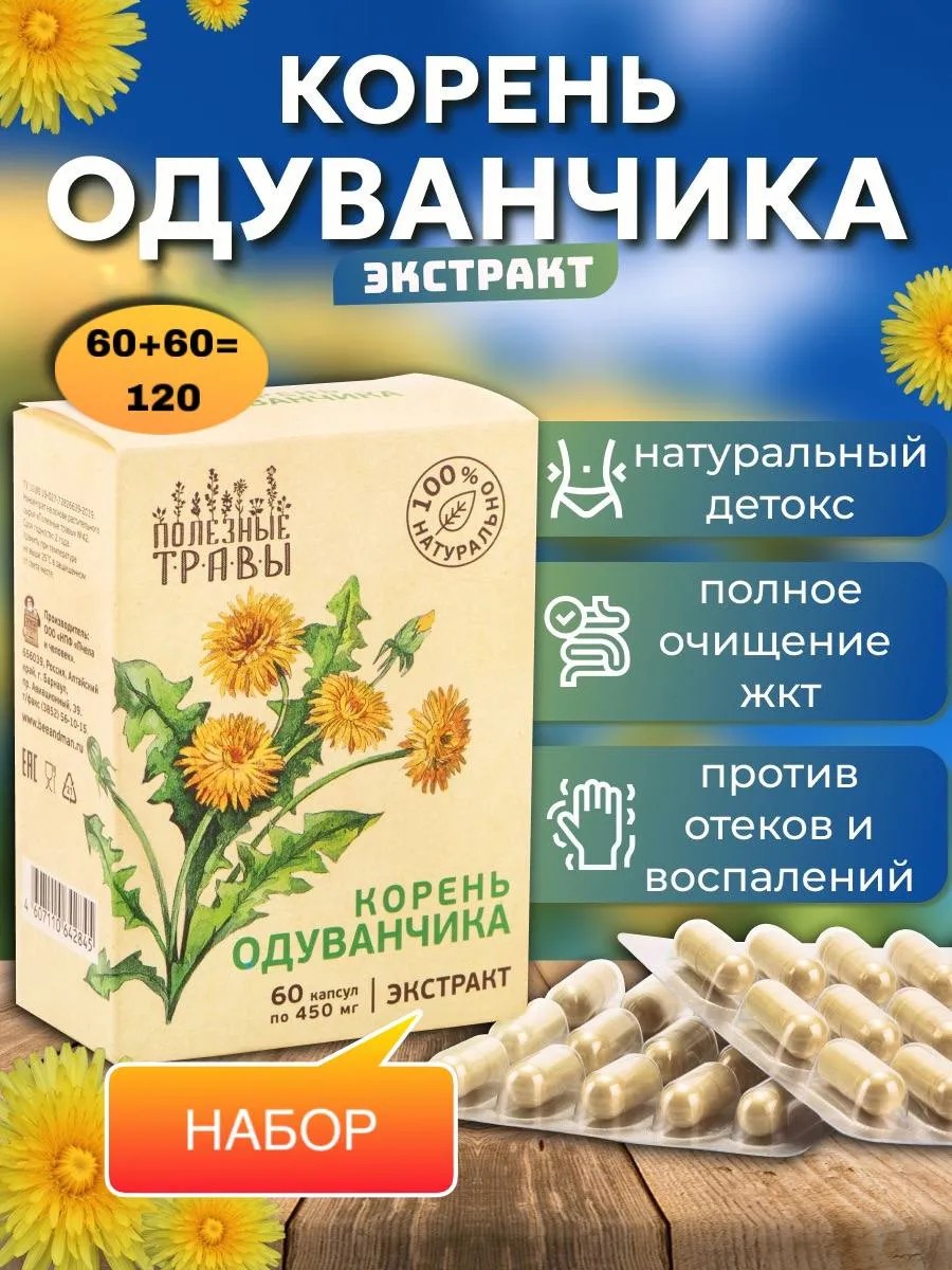 Экстракт оказывает выраженное детоксицирующее действие, обладает кровоочищающим действием, стимулирует лимфодренажные функции организма. Корень одуванчика в капсулах положительно влияет на печень, имеет противовоспалительные, гепатопротекторные , желчегонные, спазмолитические, противопаразитарные свойства, применяют при недугах желчевыводящих путей. Способствует нормализации работы желудочно-кишечного тракта, улучшению пищеварения за счет содержания растительных горечей в составе. Содержит инулин, природный пребиотик, улучшает состояние кишечной микрофлоры, оказывает мягкое слабительное действие, применяется при дисбактериозе, метеоризме, запорах, колитах. Усиливает выработку инсулина, регулирует липидный, углеводный обмен веществ, применяют при сахарном диабете, для снижения холестерина в крови, способствует очищению сосудов. Рекомендовано при недугах опорно-двигательного аппарата, снимает воспаление суставов, оказывает противоотечное действие, способствует регенерации хрящевой ткани. Травяной сбор обладает мочегонным от отеков действием, применяется при проблемах почек и мочевыводящих путей, способствует профилактике камнеобразования. Способ применения: по 1 капсуле 3 раза в день во время приема пищи.