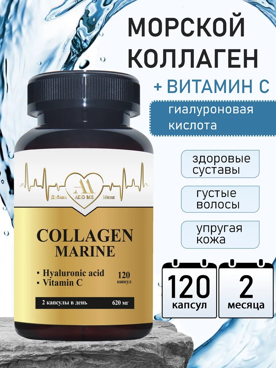 Морской коллагеновый комплекс от ADD ME — это инновационная формула, объединяющая пептиды коллагена I типа, гиалуроновую кислоту и витамин С. Благодаря особой форме выпуска в капсулах, все компоненты максимально усваиваются организмом.