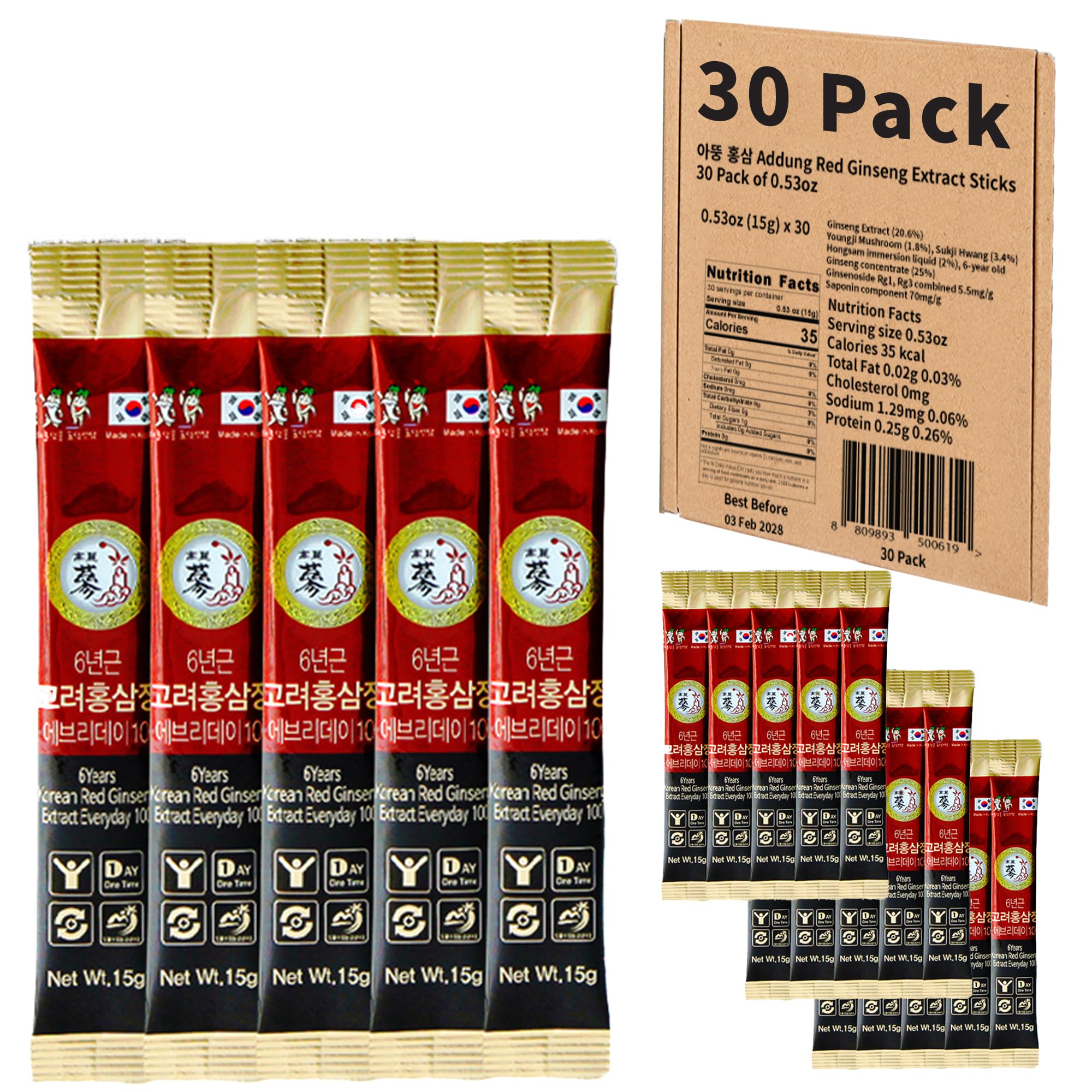 Addung 30 Pack of 0.53oz Korean Red Ginseng Extract Sticks - 6-Year-Old Ginseng for Optimal Benefits for You - Daily Upgrade - Perfect for Pre/Post Workout (30 Sticks of 0.53oz)