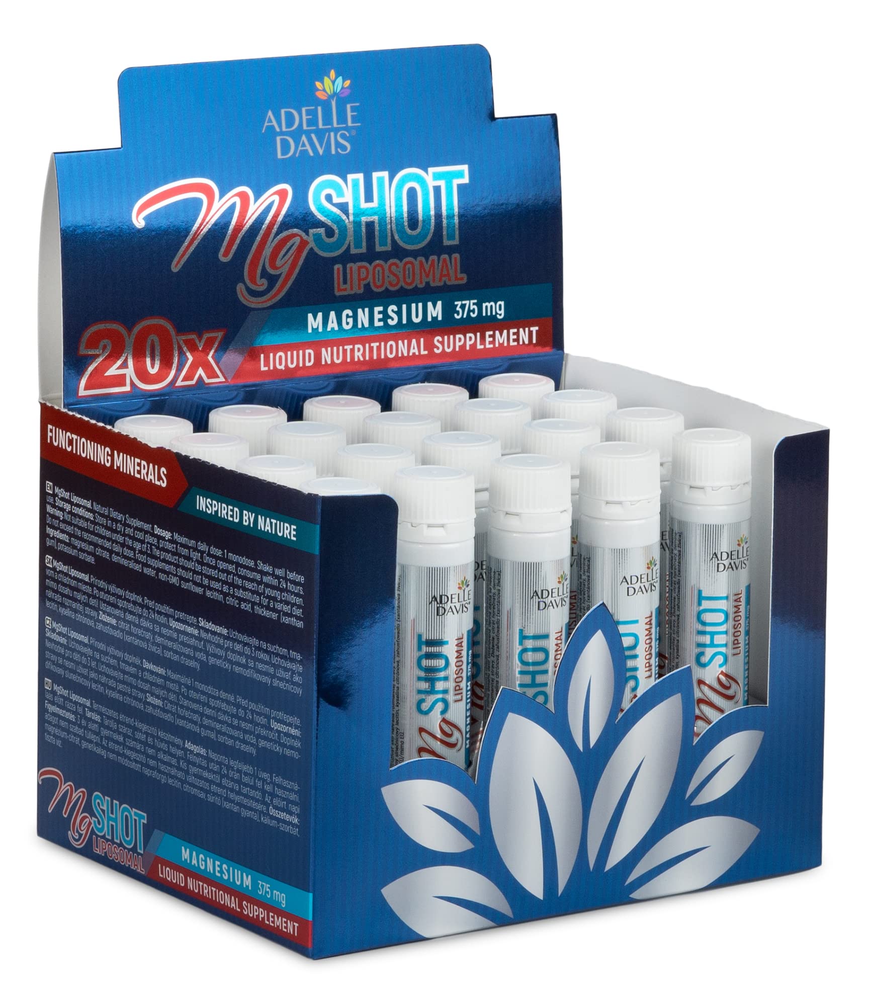 Adelle Davis MgSHOT Liposomal 20 drinkable ampoules 375 mg magnesium in each shot high-dose liquid formula with sunflower lecithin vegan non-GMO soy and gluten free