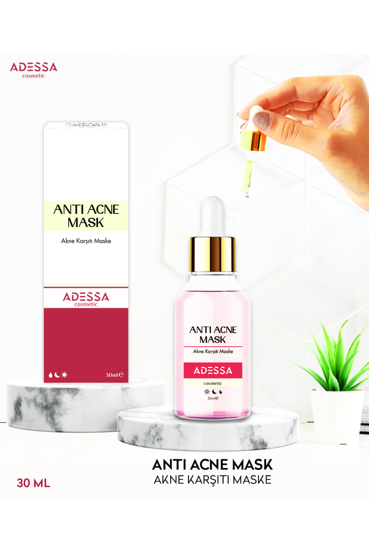 Adessa Anti Acne Mask - Akne Karsiti Maske 30 ml, özel formülüyle ciltteki akne olusumunu hedef alarak etkili bir çözüm sunar. Zengin içerigi, Calamine, Zinc Oxide ve Calendula Officinalis Flower Extract ile cildinizi rahatlatir, pürüzsüzlükleri düzenler, siyah noktalarin giderilmesine yardimci olur ve cilt tonunu esitlemeyi amaçlar.