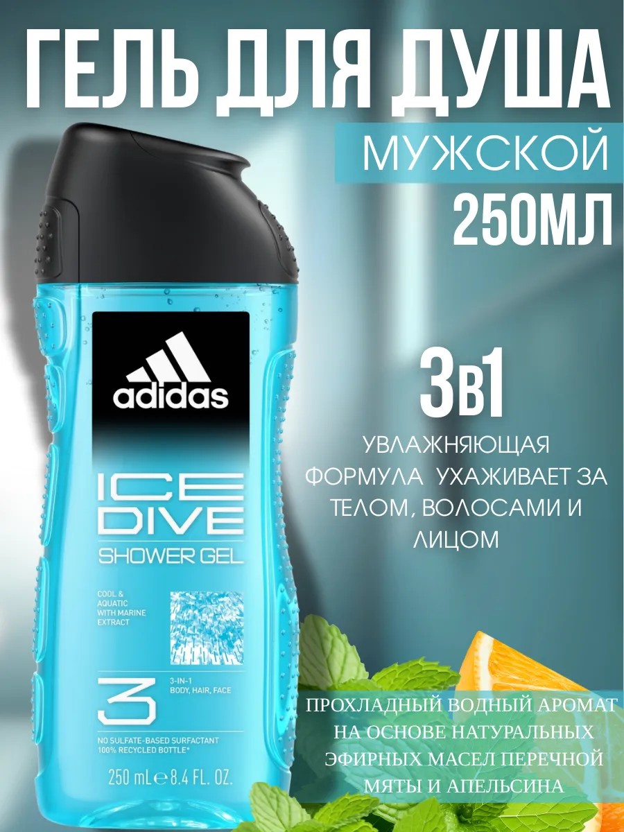 Adidas ICE DIVE гель для душа, шампунь и гель для умывания для мужчин с морской солью и свежим ароматом. Заряжает свежестью. - Его уникальная формула 3 в 1 увлажняет тело, бережно очищает лицо и кондиционирует волосы. - Подходит для ежедневного применения / Не нарушает pH баланс / Формула прошла дерматологическое тестирование.