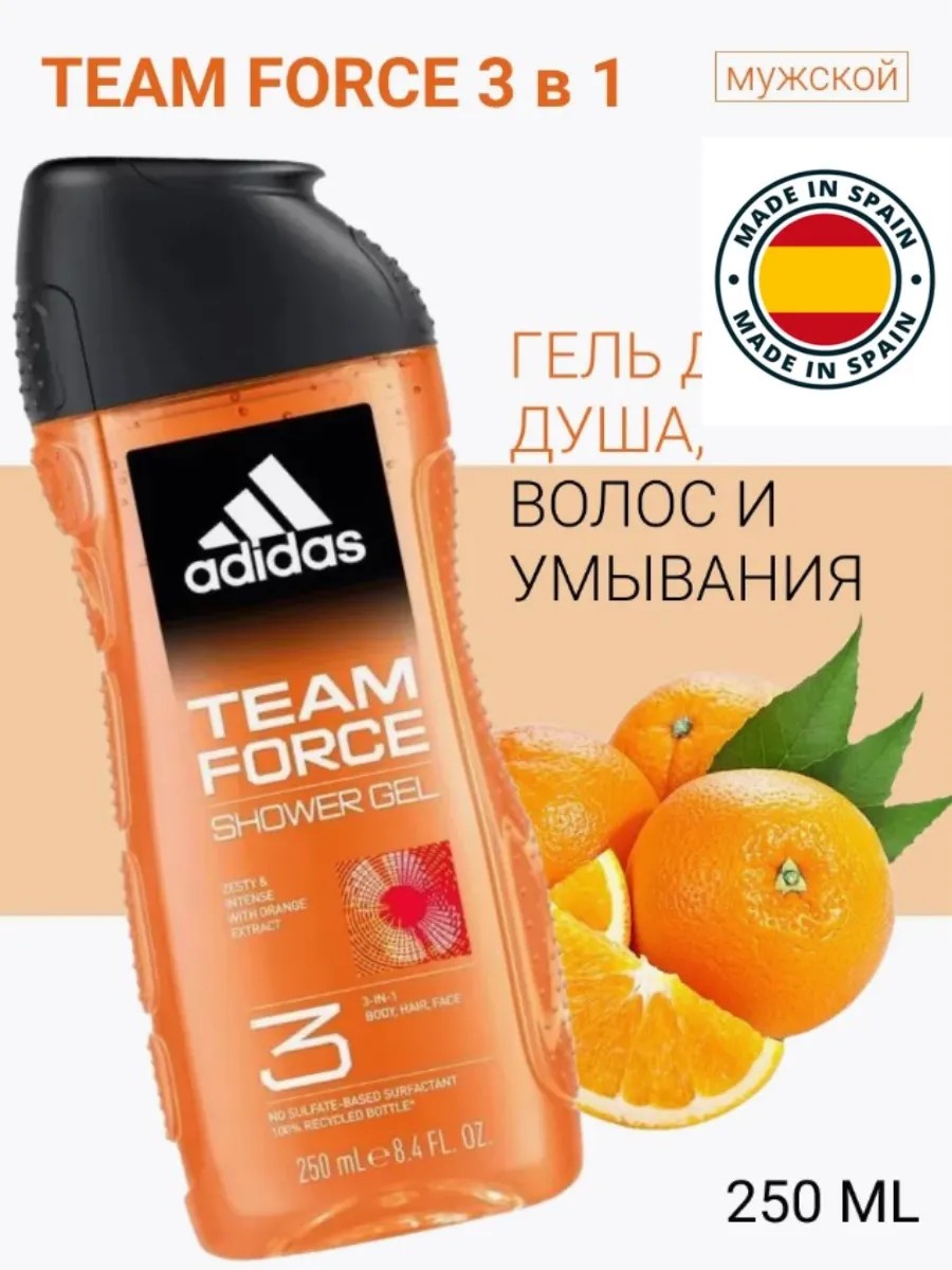 Гель для душа Adidas Team Force 3в1 предлагает комплексный и универсальный уход за лицом, телом и волосами. Особенно он подходит мужчинам. Прекрасно очищает и увлажняет кожу лица. Очищает и освежает кожу головы, удаляет излишнюю жирность. Кроме того, гель для душа увлажняет и очищает кожу тела, придает коже ощущение свежести и приятности. Гель для душа Adidas Team Force 3в1 с экстрактом апельсина имеет свежий древесный аромат – он придает больше энергии и сил. Состав дерматологически протестирован и pH-сбалансирован. Подходит для ежедневного использования