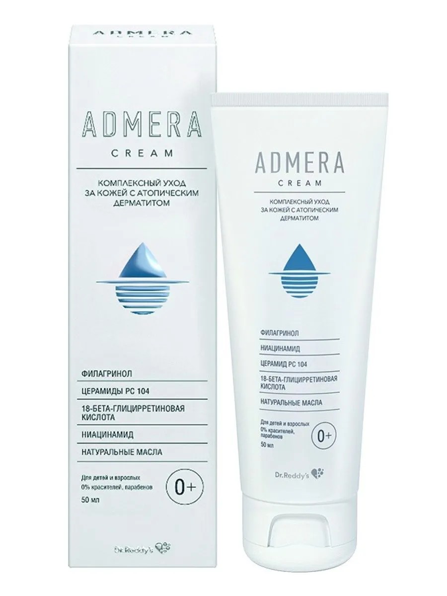 адмера крем для ухода за сухой и чувст кожей лица/тела для детей 0+ и взрослых 50мл. обеспечивает увлажнение, уменьшает выраженность и тяжесть атопического дерматита, смягчает и придает коже эластичность для ухода за сухой и чувствительной кожей тела филагринол+церамид рс104+ниацинамид+18-бета глицеритиновая кислота+ натуральные липиды крем адмера - инновационный эмолент, разработанный с учетом потребностей сухой, чувствительной и склонной к атопии коже.специальные особенности:не содержит парабенов, красителей, которые вызывают раздражение кожиклинически доказано и рекомендовано с первых дней жизнион содержит полный комплекс компонентов, необходимых такой коже, для увлажнения, восполнения липидного баланса, питания, снятия раздражения. при этом крем адмера не только восполняет компоненты, которых не хватает, но и способствует активации собственных ресурсов для восстановления защитных свойств кожи.крем адмера оказывает комбинированное действие за счет различных компонентов, входящих в состав:обеспечивает высокую степень увлажнения кожи.восстанавливает липидный обмен.смягчает и придает коже эластичность.успокаивает раздражение, облегчает зуд.восстанавливает барьерную функцию кожи.что входит в состав крема адмера?филагринол 5% - активирует синтез собственного филаггрина, важнейшего структурного белка эпидермиса, который обеспечивает формирование прочного рогового слоя, поддержание высокого уровня увлажненности кожи и необходимого для кожи слабо кислого ph. таким образом образуется защитный барьер кожи, предотвращающий потерю воды, и снижающий риск проникновения аллергенов и микроорганизмов. кроме этого, филагринол обладает антиоксидантным эффектом, защищая кожу от повреждающего действия неблагоприятных внешних факторов и предотвращая преждевременное старение кожи.ниацинамид 4% - водорастворимый витамин в3, активирует синтез церамидов и других межклеточных липидов, оказывая влияние на восстановление липидного баланса и защитного барьера кожи. кроме того, он улучшает м