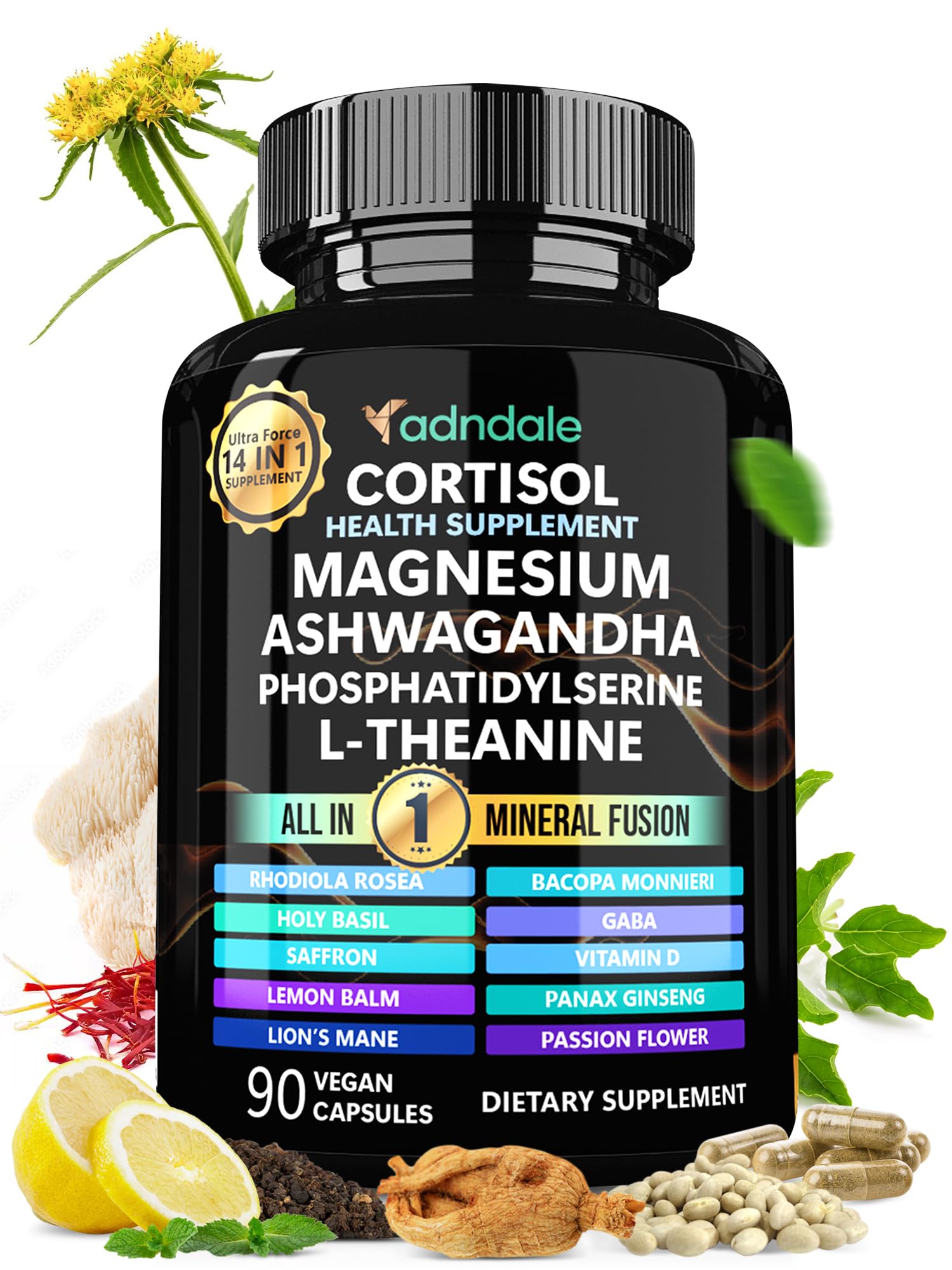 Adndale Cortisol Supplements for Women. Cortisol Reducer 14-in-1 Ashwagandha Supplement with Magnesium Glycinate L-Theanine & More. 90 Capsules.