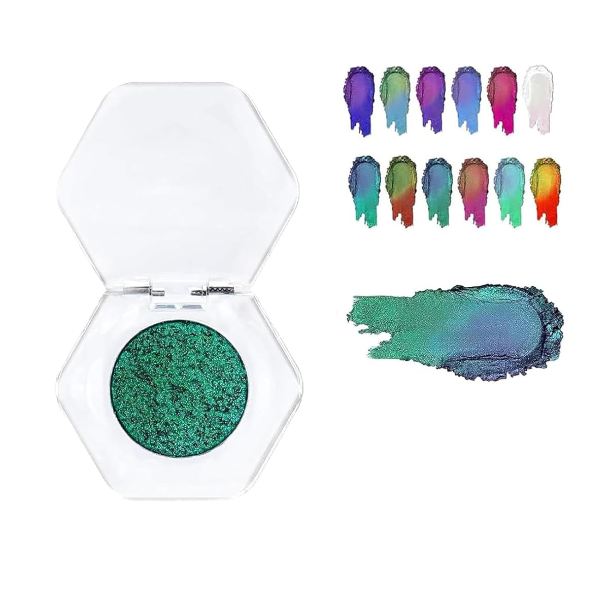 Specifications: Color: as shown. Net weight: 27g Shelf life: 3 years Package includes: 1 Glitter Color Changing Eyeshadow Notice: 1. Due to the light and screen difference, the item's color may be slightly different from the pictures. 2. Please allow slight dimension difference due to different manual measurement. SAFETY WARNING noEasy to Use Use your fingers or a flat eyeshadow brush and apply it alone for a subtle, soft look, or layer it over eyeshadow for something more dramatic. Skin-Friendly Suitable for all skin tones and sensitive skin types. Long-Lasting Wear The high-quality eyeshadow formula won't fade or crease, ensuring your makeup stays intact from morning to night. Rich Color Choices Our eyeshadow collection offers a diverse range of colors, from soft matte to shimmering glitter, to suit any makeup look. Easy Blending Formula Our holographic eyeshadows blend effortlessly, allowing you to mix and match colors to easily create stunning everyday looks. Spécifications : Couleur : comme indiqué. Poids net : 27 g Durée de conservation : 3 ans Le forfait comprend : 1 Fard à paupières changeant de couleur scintillante Avis : 1. En raison de la différence de lumière et d'écran, la couleur de l'article peut être légèrement différente de celle des images. 2. Veuillez permettre une légère différence de dimension en raison de différentes mesures manuelles. AVERTISSEMENT DE SÛRETÉ noFacile à utiliser Utilisez vos doigts ou un pinceau plat pour fard à paupières et appliquez-le seul pour un look subtil et doux, ou superposez-le sur le fard à paupières pour quelque chose de plus spectaculaire. Respectueux de la peau Convient à tous les tons de peau et types de peaux sensibles. Usure longue durée La formule du fard à paupières de haute qualité ne se décolore pas et ne se froisse pas, ce qui garantit que votre maquillage reste intact du matin au soir. Choix de couleurs riches Notre collection de fards à paupières offre une gamme variée de couleurs, du mat doux aux paillettes scintillantes, pour s'adapter à n'importe quel maquillage. Formule de mélange facile Nos fards à paupières holographiques se mélangent sans effort, vous permettant de mélanger et d'assortir les couleurs pour créer facilement de superbes looks de tous les jours.