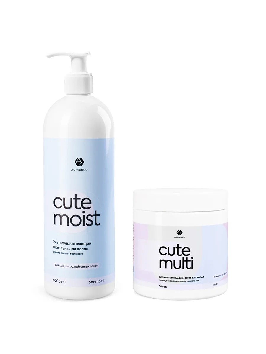 Cute Moist - набор шампунь и маска для волос (1000 мл + 500 мл). Легкий питательный шампунь для ежедневного увлажнения и заботы о сухих волосах Adricoco Cute Moist Shampoo. Прекрасно пенится и смывает все загрязнения, глубоко очищает кожные покровы, избавляя их от ороговевших клеток, хорошо справляется с кожным дискомфортом и ощущением стянутости.