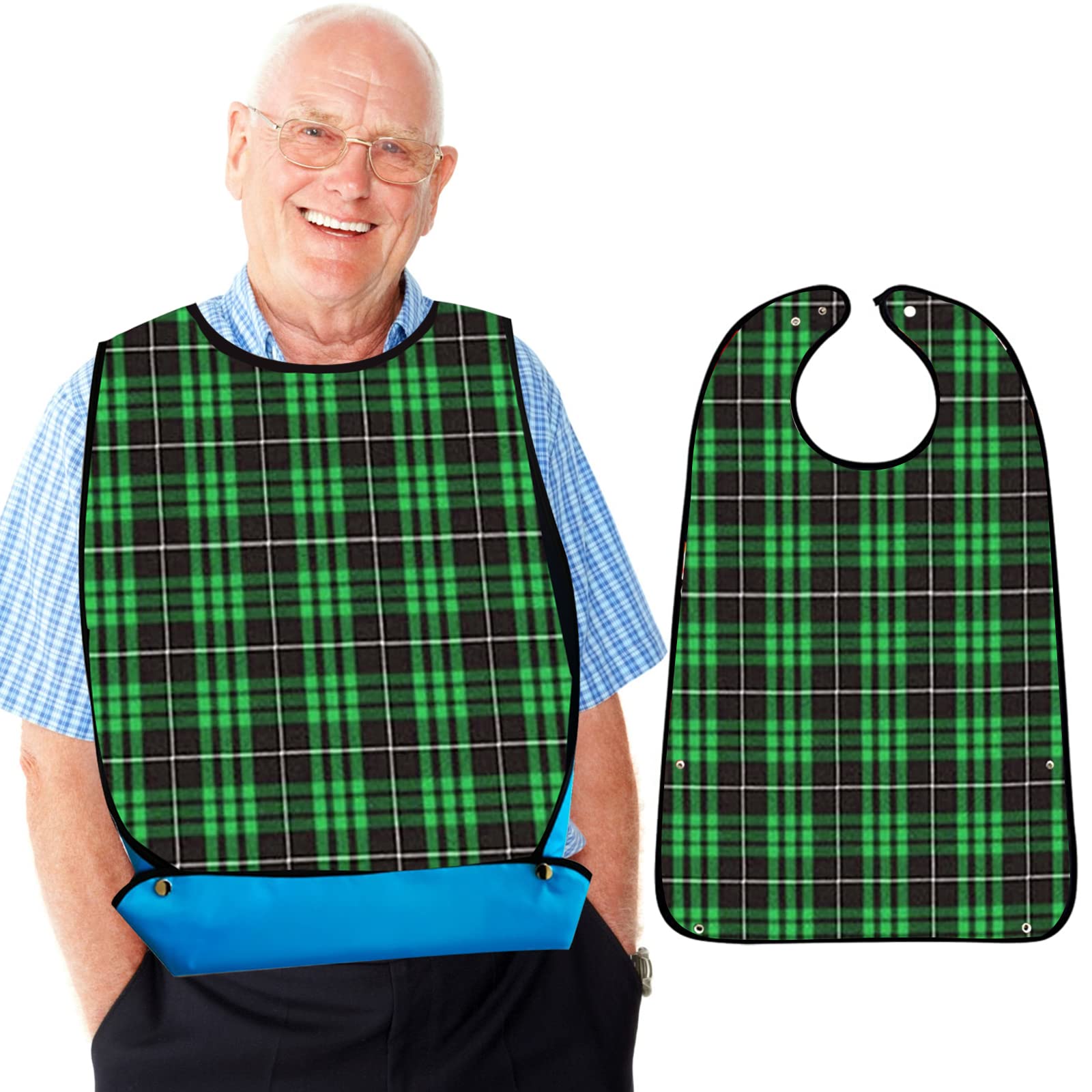 The adult bibs for men come with green grids pattern, simple and classtic, let you keep clean without losing elegance, an ideal adult bibs for eating. Feature: 1. There are 2 buttons at the bottom of the mens bibs for eating , you can roll it up as a crumb catcher in case food dropping down. 2. With 2 copper buttons on the neck part, the waterproof bibs for adults are adjustable and easy to take on and take off. 3. Made of high quality waterproof material, the bib for men is breathable, comfortable, anti-oil, easy to clean. 4.The classic elderly bibs is suitable for messy eater, bedridden, convalescent. Specifications: Material: Polyester and PVC Size: 29.53*19.69/75*50cm Color: Green Package included: 1 x Adult Bibs for Men