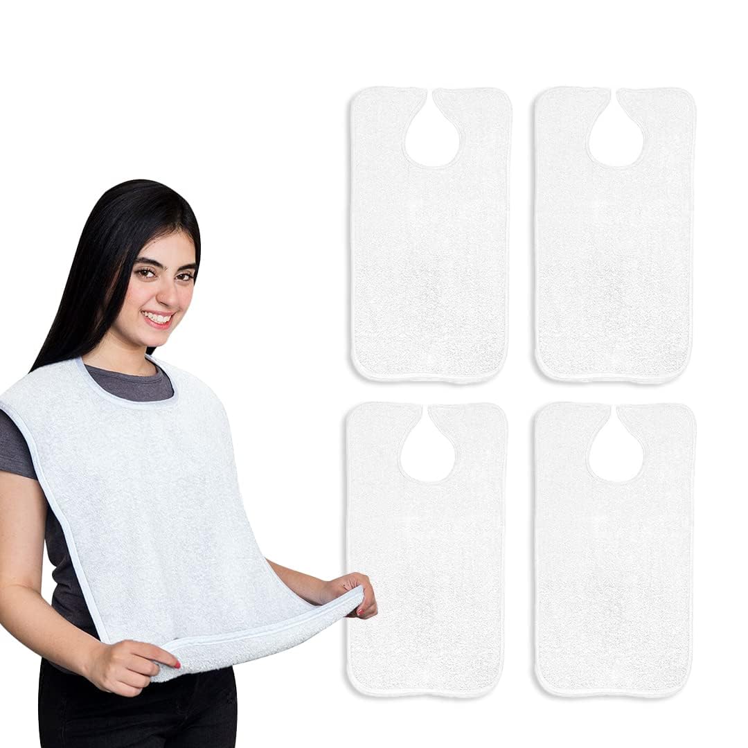 ?Material?Easy and lightweight, these terry bibs for adults are made from 100 cotton material. ?Use?These towel bibs are suitable for nursing homes, elderly homes and disable adults. ?Design?wearing and taking off the terry bibs is a piece of cake as they are designed with a hook and loop closure, the stick on Velcro stays as good as new even after multiple washes. ?Wash method?All spills are easily cleaned with a single spin in the machine, washable adult bibs are also easy to dry in the machine, and this makes these bibs the best deal of all. ?Keep your dress from getting messy?Don't worry about the mess on the dress, these 18" x 30" inches long and wide adult bibs are ultimate clothing protectors.?Keep your dress from getting messy?Don't worry about the mess on the dress, these 18" x 30" inches long and wide adult bibs are ultimate clothing protectors. ?Wash method?All spills are easily cleaned with a single spin in the machine, washable adult bibs are also easy to dry in the machine, and this makes these bibs the best deal of all. ?Design?wearing and taking off the terry bibs is a piece of cake as they are designed with a hook and loop closure, the stick on Velcro stays as good as new even after multiple washes. ?Use?These towel bibs are suitable for nursing homes, elderly homes and disable adults. ?Material?Easy and lightweight, these terry bibs for adults are made from 100 cotton material.
