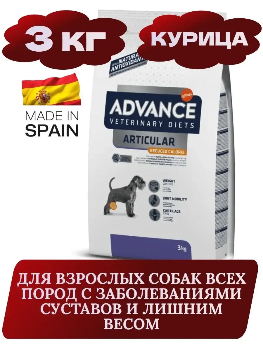 ADVANCE VETERINARY DIETS Articular Reduced Calorie - это полноценное и сбалансированное диетическое питание, разработанное для восстановления и питательной поддержки лечения взрослых собак с избыточным весом с проблемами суставов. ADVANCE ВЕТЕРИНАРНЫЕ ДИЕТЫ Articular Reduced Calorie помогает снизить вес и сохранить здоровье суставов и подвижность у собак с избыточным весом, благодаря своей низкокалорийной формуле. Ингредиенты: Курица , пшеница , обезвоженные белки тунца , рис , пшеничная мука , обезвоженные животные белки , кукурузная глютеновая мука , гороховое волокно , Гидролизованные животные белки , животный жир, стабилизированный смесью природных токоферолов , свекольный жом , Гидролизованный коллаген (3%) , рыбий жир (источник EPA) , кукуруза , Растительные волокна , дрожжи , калия хлорид , соль , глюкозамин (650 мг/кг) , хондроитин сульфат (450 мг/кг) , гиалуроновая кислота (30 мг/кг) , Хорошо усваиваемые ингредиенты: вареный рис, гидролизованные животные белки . Пищевые добавки: Витамин А 27000 МЕ, Витамин D31800 МЕ, Витамин Е700, Витамин С500, Моногидрат сульфата железа 260 мг (Fe: 86 мг), Йодид калия 1,9 мг (I: 1,4 мг), Пентагидрат сульфата меди33 мг (Cu: 8,8 мг), Моногидрат сульфата марганца 123 мг (Mn: 40 мг), Сульфат цинка моногидрат 407 мг (Zn: 148 мг), Селенит натрия 0,24 мг (Se: 0,1 мг), С природными антиоксидантами. Аналитические компоненты: 28.0% Белок, 12.5% Содержание жира, 6.0% Сырые волокна, 6.5% Неорганические вещества ,0.7% Омега 3 , 1.9% Омега 6 .