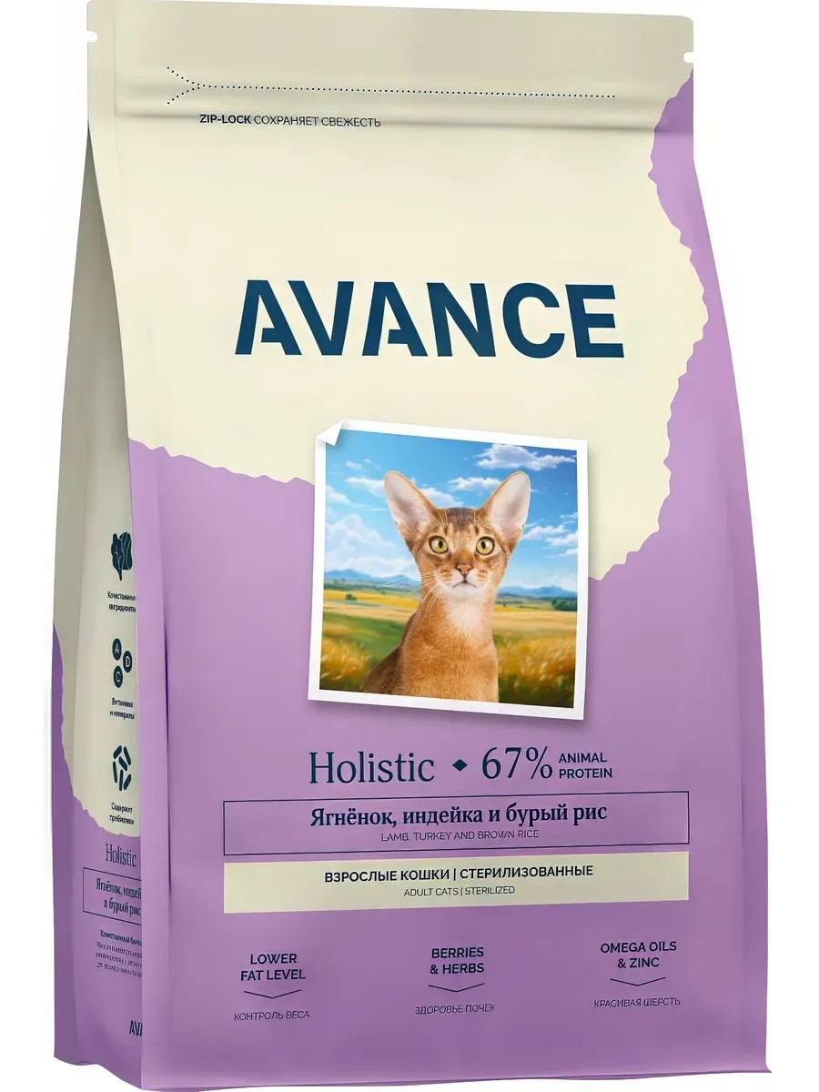 Корм Avance Holistic Adult Sterilized Lamb, Turkey & Brown Rice для стерилизованных, с ягненком, индейкой и бурым рисом, 2.5 кг. AVANCE - сбалансированные полнорационные корма с бурым рисом класса холистик с высоким содержанием животного белка. Созданы специально для поддержания здоровья кошек, домашних животных с аллергией / пищевой непереносимостью курицы и/или глютена. Преимущества корма: гипоаллергенный - отсутствие курицы и глютена минимизирует риск развития аллергической реакции у питомца; качественный белок - мясо ягнёнка богато жирами, аминокислотами и витаминами для здоровой жизни питомца; контроль веса - пониженное содержание жиров и клетчатка в составе нормализуют обменные процессы в организме; легко усваивается - содержит легкоусвояемые белки и углеводы, способствующие здоровому пищеварению; здоровье почек - ягоды и травы в составе обеспечивают здоровье мочевыделительной системы; красивая шерсть - цинк, Омега-3 и Омега-6 способствуют поддержанию здоровья кожи и качества шерсти. Корм не содержит ГМО, сои, искусственных ароматизаторов и красителей. Размер гранул: высота 7-8 мм, толщина 5-6 мм. Рекомендации по кормлению: Нормы кормления могут варьироваться в зависимости от возраста, породы, состояния, активности и условий содержания животного. Обеспечьте кошке постоянный доступ к свежей питьевой воде. Состав: Дегидрированное мясо индейки 33%, бурый рис, нут, гидролизованные мясо и печень ягнёнка 10%, овсяные хлопья, жир индейки 4%, яйцо сушёное цельное 3%, белки плазмы (источник иммуноглобулинов), свекольная стружка, морковь, пивные дрожжи, гороховые волокна, семена льна, лососёвое масло 1, 5%, DL-метионин, растительная клетчатка, маннаноолигосахариды (MOS), фруктоолигосахариды (FOS), L-цистеин, клюква, минералы, витамины, таурин, гемоглобин, экстракт юкки Шидигера, экстракт бархатцев, хлорелла, смесь токоферолов и экстракта розмарина