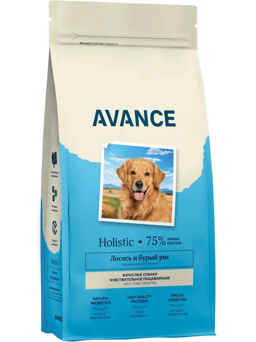 Avance Holistic Sensitive Grain-Free Dog Food with Salmon and Brown Rice, 10 kg. Avance Holistic Sensitive Grain-Free Dog Food with Salmon and Brown Rice AVANCE is a source of energy for happy moments together! AVANCE is a balanced, complete holistic food with brown rice and a high content of animal protein. It is specially created to support the health of dogs and pets with allergies / food intolerances to chicken and / or gluten. Advantages of the food: hypoallergenic - the absence of chicken and gluten minimizes the risk of an allergic reaction in your pet; high-quality protein - salmon is an alternative source of animal protein, ideal for sensitive digestion; easily digestible - contains easily digestible proteins and carbohydrates that promote healthy digestion; Microflora balance – a prebiotic complex promotes the formation of natural beneficial microflora in the intestines and enhances the body's defenses; improves digestion – a complex of various types of dietary fiber and herbs has a beneficial effect on digestion. The food does not contain GMOs, soy, artificial flavors, or colors. Granule size: height 10-11 mm, thickness 6-7 mm. Ingredients: dehydrated sea fish 30%, oat flakes, brown rice, turkey fat 10%, hydrolyzed salmon meat 8%, whole dried egg 2%, plasma proteins (source of immunoglobulins), vegetable fiber, beetroot shavings, carrots, brewer's yeast, flax seeds, salmon oil 1%, mannan-oligosaccharides (MOS), fructooligosaccharides (FOS), L-cysteine, minerals, vitamins, dandelion, lecithin, psyllium, sea buckthorn, hemoglobin, glucosamine, chondroitin, chlorella, a mixture of tocopherols and rosemary extract, yucca schidigera extract. Caloric content per 100 g: 391 kcal.