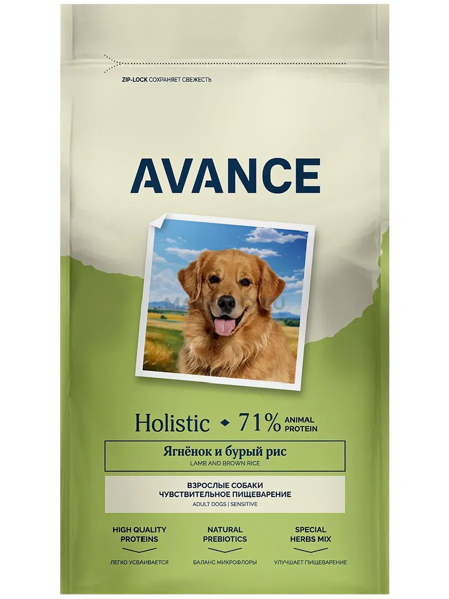 Avance Holistic Sensitive Lamb Brown Rice Dog Food for Sensitive Digestion, Holistic, with Lamb and Brown Rice, 3 kg AVANCE is a source of energy for happy moments together! AVANCE is a balanced, complete food with brown rice, holistic class, and a high content of animal protein. It is specially created to support the health of cats and dogs, pets with allergies / food intolerances to chicken and / or gluten. Advantages of the food: hypoallergenic - the absence of chicken and gluten minimizes the risk of an allergic reaction in your pet; high-quality protein - lamb is rich in fats, amino acids and vitamins for a healthy life for your pet; easily digestible - contains easily digestible proteins and carbohydrates that promote healthy digestion; microflora balance - a complex of prebiotics promotes the formation of natural beneficial microflora in the intestines, as well as increases the body's defenses; improves digestion - a complex of various types of dietary fiber and herbs has a beneficial effect on digestion. This food does not contain GMOs, soy, artificial flavors, or colors. Feeding guidelines: Feeding guidelines may vary depending on the age, breed, condition, activity level, and living conditions of the animal. Provide your dog with constant access to fresh drinking water.