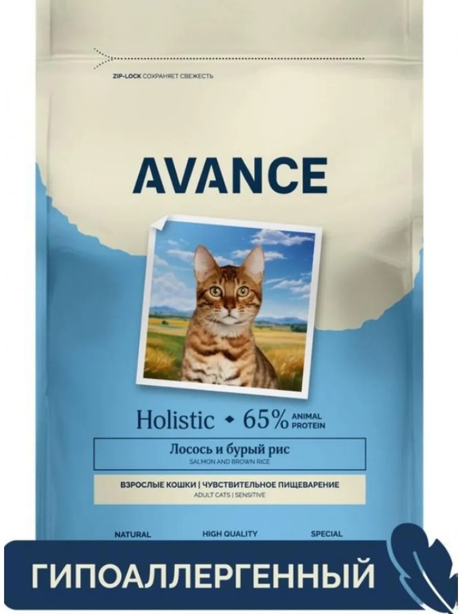AVANCE – сбалансированные полнорационные корма с бурым рисом класса холистик с высоким содержанием животного белка. Созданы специально для поддержания здоровья кошек, домашних животных с аллергией / пищевой непереносимостью курицы и/или глютена.Преимущества корма:- гипоаллергенный – один вид мяса в составе, отсутствие курицы и глютена минимизирует риск развития аллергической реакции у питомца;- качественный белок – лосось – альтернативный источник животного белка, идеально подходит для чувствительного пищеварения;- легко усваивается – содержит легкоусвояемые белки и углеводы, способствующие здоровому пищеварению;- баланс микрофлоры – комплекс пребиотиков способствует формированию естественной полезной микрофлоры в кишечнике, а также повышению защитных свойств организма;- улучшает пищеварение – комплекс различных видов пищевой клетчатки и трав благоприятно влияет на пищеварение.Корм не содержит ГМО, сои, искусственных ароматизаторов и красителей.