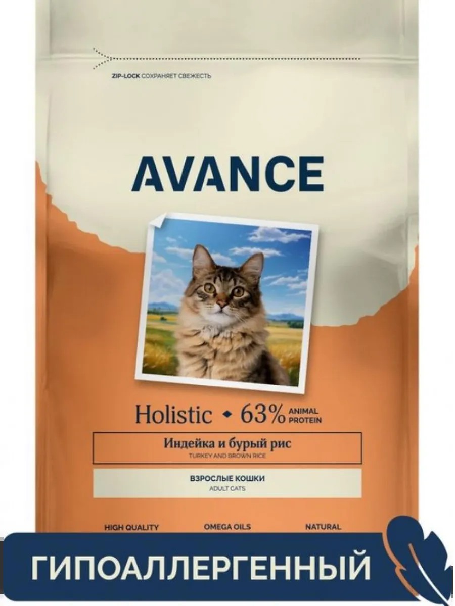 AVANCE – сбалансированные полнорационные корма с бурым рисом класса холистик с высоким содержанием животного белка. Созданы специально для поддержания здоровья кошек, домашних животных с аллергией / пищевой непереносимостью курицы и/или глютена.Преимущества корма:- гипоаллергенный – один вид мяса в составе, отсутствие курицы и глютена минимизирует риск развития аллергической реакции у питомца;- качественный белок – мясо индейки обеспечивает необходимое количество белка и питательных веществ;- легко усваивается – содержит легкоусвояемые белки и углеводы, способствующие здоровому пищеварению;- красота кожи и шерсти – пивные дрожжи, цинк, Омега-3 и Омега-6 способствуют поддержанию здоровья кожи и качества шерсти;- сильный иммунитет – пребиотики и природные антиоксиданты помогают укрепить иммунитет и повышают общий тонус организма.Корм не содержит ГМО, сои, искусственных ароматизаторов и красителей.