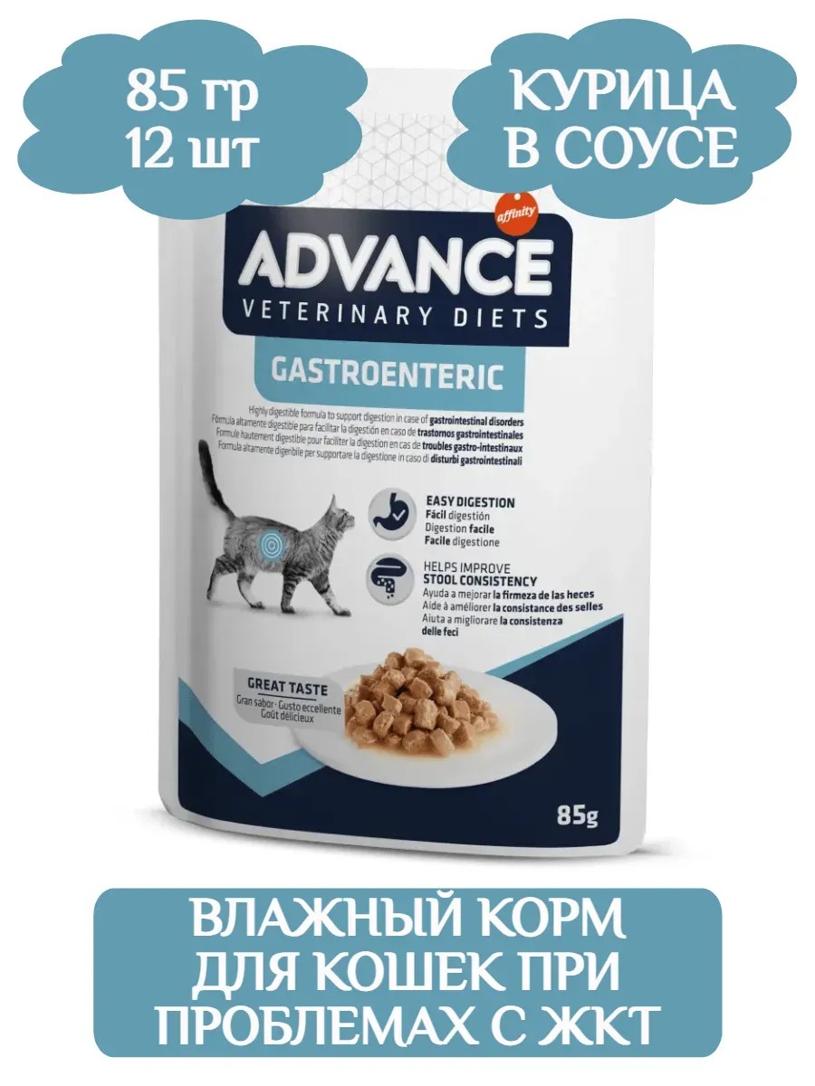 Advance Gastroenteric - влажная ветеринарная диета при желудочно-кишечных проблемах у кошек. Advance Veterinary Diets Gastroenteric — это полноценный и сбалансированный диетический корм для взрослых кошек и котят, который помогает компенсировать расстройства пищеварения, экзокринную недостаточность поджелудочной железы и уменьшить нарушения кишечного всасывания. Он создан с использованием легкоусвояемых ингредиентов, низким содержанием клетчатки и повышенным содержанием натрия и калия. Продукт содержит отобранные источники белка для улучшения пищеварения и пребиотики, которые улучшают развитие полезной кишечной флоры. Аналитический состав: 8.2% Сырой протеин, 3,6% сырой жир, 0,3% сырая клетчатка, 1,6% сырая зола, 83% влага, 0,16% натрий, 0,18% калий. Пищевые добавки: Витамин D3 203 МЕ, витамин Е 84 мг, таурин 465 мг, 3б202 (I: 0,51 мг), 3б405 (Cu: 1,34 мг), 3б103 (Fe: 22,3 мг), 3б503 (Mn: 2,7 мг), 3б605 (Zn: 22,4 мг).