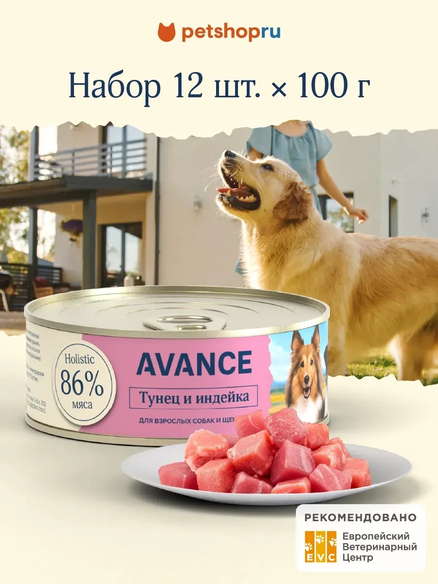 AVANCE holistic Консервы для собак и щенков с тунцом и индейкой, 12 х 100 г
