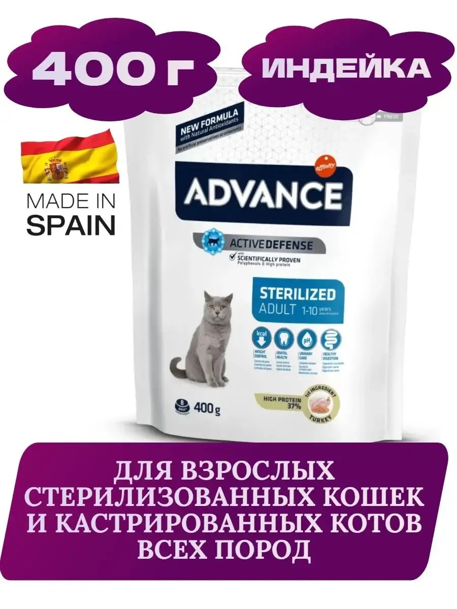 Advance Cat Sterilized (Индейка) — это высококачественный сбалансированный полнорационный корм с индейкой для взрослых стерилизованных кошек. Активные иммуноглобулины - натуральные протеины для улучшения пищеварения и поддержания здоровья кишечника. Высокое содержание протеинов обеспечивает оптимальный уровень протеинов, которые способствуют улучшению иммунной системы и формированию мышечной ткани. Природные полифенолы в комбинации с витаминами способствуют замедлить процесс старения клеток. L-карнитин помогает переработать жировые клетки в энергию, сжигая избыточные жировые клетки в организме кошки. Необходимый РН моси и содержание глюкозамина способствует правильному функционированию мочевыводящих путей и почек, снижает риск формирования камней в мочевом пузыре. Пирофосфаты - специальные минералы, которые помогают предотвратить образование зубного налета и уменьшают неприятный запах. Аналитический состав: Протеин 37,0%, жирность 10,5%, сырые волокна 4,1%, неорганическое вещество 7,0 %. Энергетическая ценность: 3745 ккал/кг. Пищевые добавки на 1 кг: Витамин A 27000 ME, Витамин D3 1800 ME, Витамин E 500 мг, Витамин C 70 мг, Таурин 1200 мг, L-карнитин 500 мг,Моногидрат сернокислого железа 260 мг (Fe: 86 мг), Фумарат железа 150 мг (Fe: 45 мг), Йодид калия 1.9 мг (I: 1.4 мг), Пентагидрат сульфата меди 33 мг (Cu: 8.8 мг), Моногидрат сульфата марганца 123 мг (Mn: 40 мг), Моногидрат сульфата цинка 407 мг (Zn: 148 мг), Селенит натрия 0.2 мг (Se: 0.1 мг). Зоотехнические добавки: Хлорид аммония 4 г. С натуральными антиоксидантами.