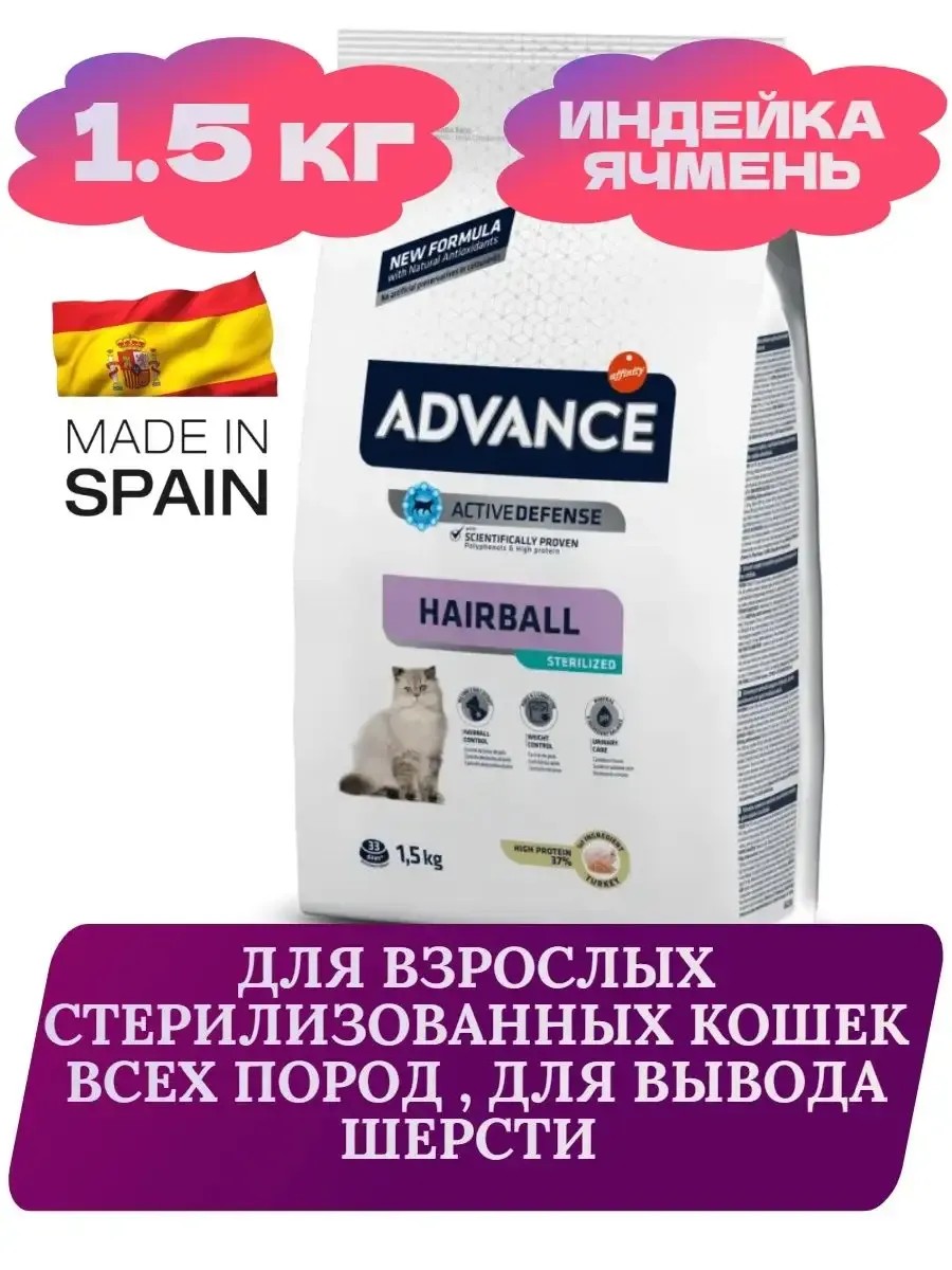 Advance Cat Sterilized Hairball (Индейка и ячмень) — это корм премиум-класса для стерилизованных кошек и кастрированных котов с проблемами образования комков шерсти. Способствуют предотвращению ожирения у стерилизованных кошек и кастрированных котов: благодаря пониженному содержанию энергетических элементов, высокому содержанию клетчатки, утоляющей голод, высокому содержанию белков и умеренному содержанию жиров этот корм способствует поддержанию мышечной массы. Волокна овса и солодовый экстракт: помогают снизить образование комков шерсти и облегчают их вывод из организма. Активные иммуноглобулины - естественные белки, которые поддерживают здоровую кишечную флору. Биотин, цинк, жирные кислоты Омега-3 и Омега-6 способствуют оздоровлению шкурки животного, а его шерсть благодаря этим добавкам приобретает здоровый блеск. Натуральные полифенолы вместе с витаминами замедляют процесс старения клеток. Л-карнитин способствует превращению жиров в энергию, уменьшая количество жировых отложений. Помогает нормальному функционированию мочевыводящих путей и почек, поддерживают здоровье мочевого пузыря. Пирофосфаты - специальные минералы, которые предотвращают образование зубного налета и способствуют свежему дыханию питомца. Волокна овса предотвращают образование комков шерсти. Аналитический состав: Белки 37,0%, содержание жира 12,0%, сырая клетчатка 4,5%, неорганические вещества 7,5%. Энергетическая ценность: 3650 ккал/кг. Пищевые добавки на 1 кг: Витамин A 27000 ME, Витамин D3 1800 ME, Витамин E 500 мг, Витамин C 70 мг, Таурин 1200 мг, L-карнитин 500 мг, Моногидрат сернокислого железа 260 мг (Fe: 86 мг), Фумарат железа 150 мг (Fe: 45 мг), Йодид калия 1.9 мг (I: 1.4 мг), Пентагидрат сульфата меди 33 мг (Cu: 8.8 мг), Моногидрат сульфата марганца 123 мг (Mn: 40 мг), Моногидрат сульфата цинка 407 мг (Zn: 148 мг), Селенит натрия 0.2 мг (Se: 0.1 мг). Зоотехнические добавки: Хлорид аммония 4 г. С натуральными антиоксидантами.
