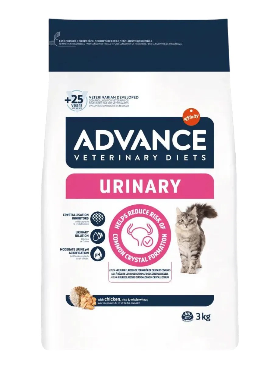 Advance VetDiets Cat Urinary is a veterinary dry food for adult cats with urolithiasis. Indications: pathologies associated with urolithiasis in cats; prevention of recurrence of urolithiasis caused by struvites and calcium oxalates; improvement of symptoms associated with idiopathic cystitis. Contraindications: pregnancy; lactation; use of drugs that acidify urine. Advantages: Optimal concentration of sodium and potassium chloride allows to increase the amount of urine (to protect the bladder mucosa in cases of FIC) and reduce the concentration of oxalate ion in the urine. Acidification of urine pH (pH = 6.0-6.3) - reduces the number of struvite-containing crystals and stones, and also helps in their destruction. The formula includes phytate and citrate - inhibiting the process of stone formation in the cat's urinary system. Moderate content of magnesium and minerals that provoke the formation of struvites - reduces the ability to precipitate calcium oxalate and struvite in urine. Moderate level of sodium - compensates for losses due to glomerular filtration. The food contains chondroitin sulfate-glucosamine (GAG) - helps restore the deficiency of glycosaminoglycan in the bladder mucosa. Low calorie content - causes a satiety effect and does not lead to weight gain in sterilized cats or cats with reduced activity. Analytical composition: Protein 35%, fat 14%, crude fiber 1.5%, inorganic matter 6.5%, calcium 0.7%, phosphorus 0.8%, sodium 0.7%, potassium 0.9%, magnesium 0.07%, chloride 1.7%, sulfur 0.4%. Energy value: 3800 kcal/kg. Food additives: Vitamin A 27,000 IU, Vitamin D31,800 IU, Vitamin E660 mg, Methionine 4,000 mg, Iron sulfate monohydrate 260 mg (Fe: 86 mg), Potassium iodide 1.9 mg (I: 1.4 mg), Copper sulfate pentahydrate 33 mg (Cu: 8.8 mg), Manganese sulfate monohydrate 123 mg (Mn: 40 mg), Zinc sulfate monohydrate 407 mg (Zn: 148 mg), Sodium selenite 0.2 mg (Se: 0.1 mg), With natural antioxidants.