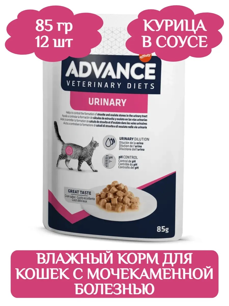 Advance Urinary - влажная ветеринарная диета для кошек с мочекаменной болезнью. ADVANCE VETERINARY DIETS FELINE URINARY — диетический полноценный корм для взрослых кошек, разработанный с недонасыщающими мочу свойствами для струвитов, подкисляющими мочу свойствами и низким содержанием магния, показанный для растворения струвитных камней и снижения рецидивов струвитных камней. Аналитический состав: 8.2% Сырой протеин, 4% сырой жир, 0,3% сырая клетчатка, 1,6% сырая зола, 82,5% влага, 0,18% кальций, 0,13% фосфор, 0,17% натрий, 0,2% калий, 0,012% магний, 0,24% хлористый, 0,2% сера. Питательные добавки: Витамин D3 203 UI, витамин Е 131 мг, таурин 465 мг, 3б202 (I: 0,51 мг), 3б405 (Cu: 1,34 мг), 3б103 (Fe: 22,3 мг), 3б503 (Mn: 2,7 мг), 3б605 (Zn: 22,4 мг). Зоотехнические добавки: 4d7 1,1 г. Технологические добавки: 1j514ii 1 г.