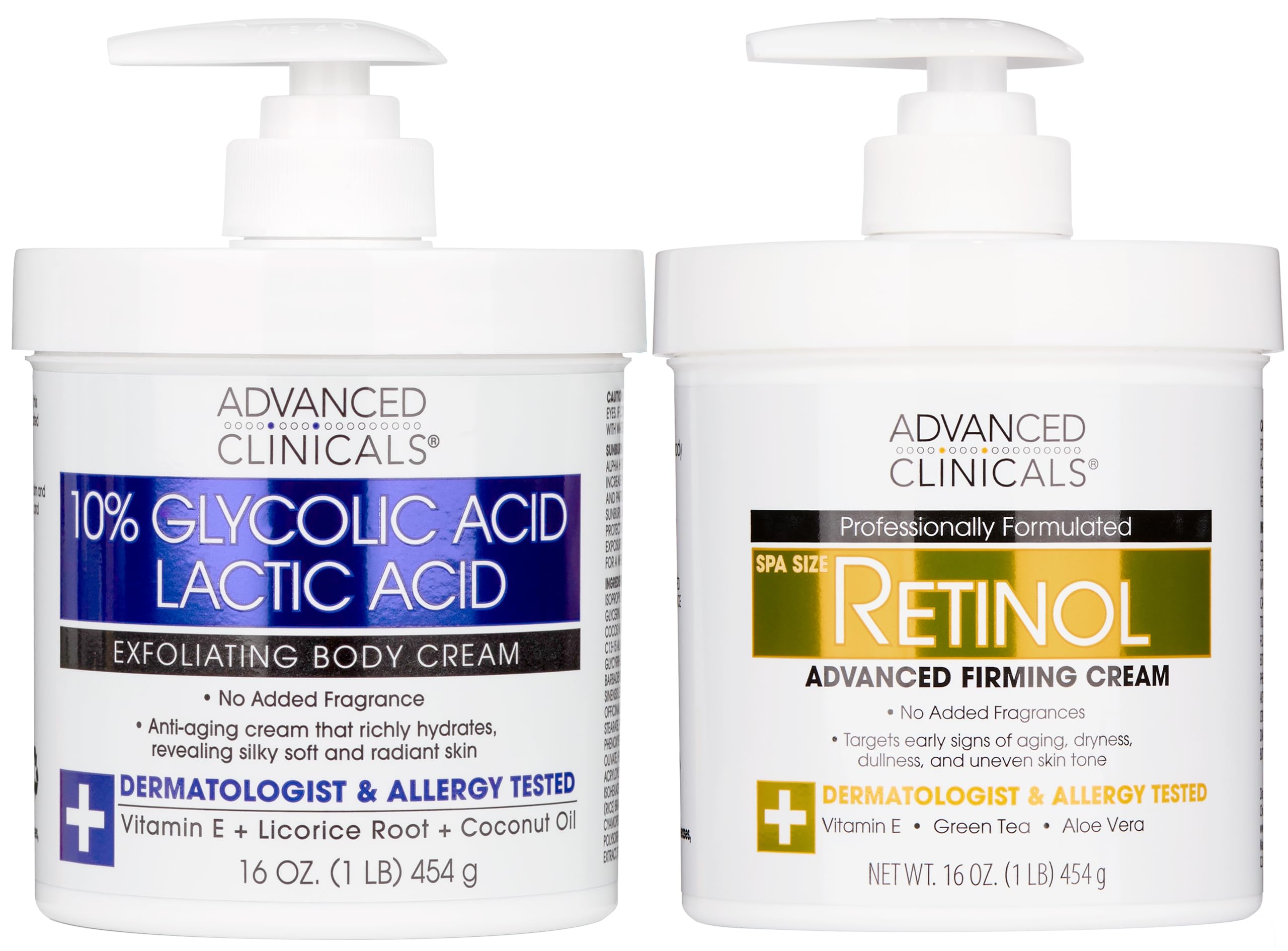 Exfoliation is key! Skin is constantly shedding dead skin cells, and by exfoliating you help turnover skin cells faster. Our 10 Glycolic Lactic Acid is the highest percentage that can be left on skin, and it's still gentle enough to be used daily. The combination of both AHA's helps exfoliate, brighten, reduce dark spots, stimulate collagen production leaving your skin soft and supple and renewed. It's time to exfoliate! Retinol Advanced Firming Cream reduces the visible signs of aging as it helps replenish your moisture barrier. Retinol Advanced Firming Cream contains natural ingredients within the formula such as Green Tea, Aloe Vera, and Chamomile.EXFOLIATE, RESTORE, RENEW – Fragrance-Free Exfoliating AHA leave-on body lotion works to effectively soften dry flakey skin, help remove dead skin cells, promote cell turnover, target keratin build ups, freshen up skin tone, help prevent breakouts clear ingrown hairs, target keratosis pilaris, reduce rough bumpy skin. Free From Any Fragrances, Mineral Oil, Rubbing Alcohols, Parabens, Dyes. Dermatologist-Tested, Allergy-Tested, Clinically-Tested Formula. HYDRATING NOURISHING – Advanced Clinicals Retinol Cream is infused with Aloe Vera, Chamomile, Glycerin, Green Tea, which all work together to effectively firm skin reduce the appearance of sun damaged skin, wrinkles, fine lines, crepey skin. Aloe Vera defends against visible redness irritation. Green Tea Chamomile guards against environmental damage reduces puffiness. Combination of ingredients make this Retinol Body Cream non-irritating unlike many other retinol products. 1 CLINICALLY PROVEN ANTI-AGING INGREDIENT – Vitamin A (Retinol) is considered to be the 1 Dermatologist recommended anti aging skin care ingredient. It is known to diminish the look of deep wrinkles, sagging skin, fine lines, crepey skin, sun damage while boosting collagen production to help with firming. First formulated for use after cosmetic procedures, this Retinol Cream is now available for anyone who wants to renew his or her skin. EXFOLIATING LOTION FOR CLEAR SKIN – This carefully formulated 10 Glycolic Acid Lactic Acid Body Lotion works to gently resurface skin, clear pores, improve skin tone texture, boost collagen production making your skin feel smoother look more radiant. Formulated with antioxidant rich moisturizing ingredients such as Coconut Oil, Aloe Vera, Green Tea, Rosemary, Squalane, Vitamin E to hydrate skin boost elasticity. Compatible with all skin types, including oily skin sensitive skin. GLYCOLIC ACID LACTIC ACID LOTION – Alpha Hydroxy Acids (AHA's) are chemical exfoliants, meaning they exfoliate the skin without rubbing or scrubbing. They are considered a gentle yet efficient way to remove dry skin, rough skin patches, dead skin cells, impurities that block pores. Effective solution for those who have hardened skin, bumps, dull skin, uneven texture, etc. Formulated to restore the skin's natural pH, promote cell renewal, smooth fine lines, bumpy skin, wrinkles.