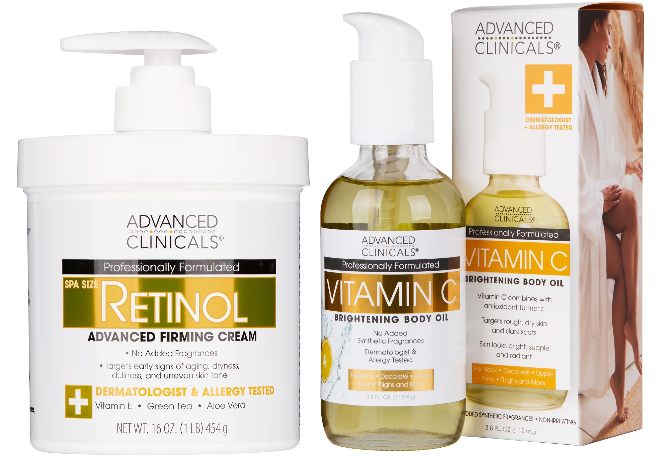 This Retinol-powered body cream, infused with Vitamin E, Green Tea, and Aloe Vera, lessens fine lines and crepey skin, promoting more plump, smoother-looking skin. It provides intense hydration while improving skin texture, leaving it visibly revitalized and nourished. The rich, velvety formula absorbs easily, enhancing skin's softness and radiance.This lightweight oil blend is infused with the rejuvenating antioxidant properties of Vitamin C, Vitamin E, Turmeric, Grapefruit Oil and Rosehip Oil that nourishes the skin for a luminescent glow. This body oil is the perfect addition to elevating your skincare routine by combining hydration with benefits to visibly improve the look of uneven skin tone while minimizing the appearance of dryness, fine lines wrinkles.RELAX RESTORE – Non-Greasy, Cruelty-Free, Fragrance-Free Formula. Free From: Parabens, Drying Alcohols, Animal-Derived Ingredients, PEGs, Sulfates, Dyes, Talc. Manufactured in our cGMP MoCRA compliant facility in Chicago, USA. RETINOL BEGINNERS, please take care to test cream on a small area of skin, gradually phg into your skincare routine, working up to twice daily as tolerated. If irritation occurs, lessen the frequency. If irritation persists, discontinue use. RADIANT SKIN – This Advanced Clinicals Vitamin C Body Oil infused with Turmeric Botanical Oils helps refine the look of aging skin and uneven skin tone. This Body Oil also helps refine the look of discolored skin, age spots, sun damage from sunspots, rough skin texture, blemishes, more. A delicate silky body oil that replenishes essential moisture and soaks into dry skin for a fresh and luminous look. VITAMIN C OIL – Incorporating a Vitamin C infused body oil into your daily skincare routine can help to promote a more healthy, radiant, youthful-looking complexion. Vitamin C helps promote an even skin tone, while also helping stimulate collagen production to improve skin elasticity firmness. Vitamin C also helps to minimize redness or irritation in the skin, helps protect from environmental stressors like UV rays, and helps lessen the appearance of fine lines, sun damage, wrinkles. HYDRATING NOURISHING – Advanced Clinicals Retinol Cream is infused with Aloe Vera, Chamomile, Glycerin, Green Tea, which all work together to effectively firm skin minimize the appearance of sun damaged skin, wrinkles, fine lines, crepey skin. Aloe Vera defends against visible redness irritation. Green Tea Chamomile guards against environmental damage lessens puffiness. Combination of ingredients make this Retinol Body Cream non-irritating unlike many other retinol products. 1 CLINICALLY PROVEN ANTI-AGING INGREDIENT – Vitamin A (Retinol) is considered to be the 1 Dermatologist recommended age rewind skin care ingredient. It is known to diminish the look of deep wrinkles, sagging skin, fine lines, crepey skin, sun damage while boosting collagen production to help with firming.