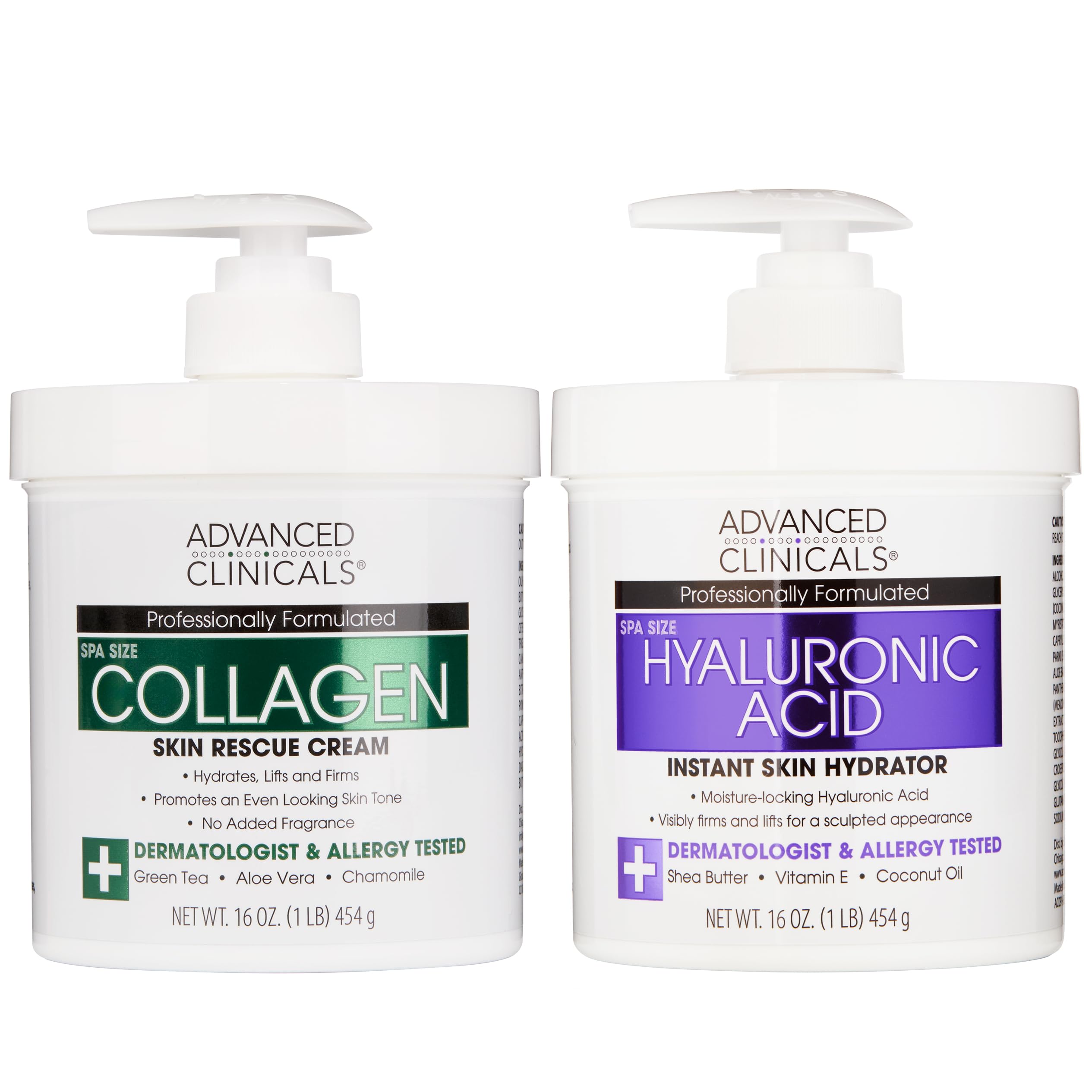 SCIENCE-BACKED SKINCARE – Advanced Clinicals offers science-driven formulas featuring well known and proven ingredients. Formulated by our in-house R D team, with over 25 years of skincare expertise, Advanced Clinicals products are dermatologist tested and formulated with your skincare goals in mind. Made in the Midwest with globally sourced materials. COLLAGEN BODY LOTION WITH GREEN TEA VITAMIN E - Provides moisture that visibly hydrates to refine texture , leaving skin refreshed and renewed. No added synthetic fragrance blends, makes it an ideal body moisturizer for men and women to improve the appearance of wrinkles, uneven skin tone, fine lines, rough skin texture. Recommended for daily use to support dehydrated skin, providing hydration to the skin and to visibly plump fine lines and sagging looking skin. COLLAGEN CREAM HYDRATES FOR VISIBLY FIRMER AND TIGHTENED LOOKING SKIN – Rich like a body butter but without the greasy finish. This advanced moisturizing body lotion enhances skin's hydration, which helps give a more plump and youthful looking appearance. Added hydration helps promote a smoother, lifted look, leaving skin visibly renewed and refreshed. This velvety body moisturizer formula delivers moisture, leaving skin feeling soft and smooth. HYALURONIC ACID BODY LOTION WITH SQUALANE, ALGAE EXTRACT, PANTHENOL (VITAMIN B5) – Helps refresh, and enhance the look of skin texture. This replenishing formula helps lock in moisture for hydration and visible skin softness to improve the appearance of wrinkles, uneven skin tone, fine lines, rough skin texture. This rich, velvety body moisturizer delivers a burst of moisture, leaving skin feeling smooth, soft, and refreshed. HYALURONIC ACID CREAM HYDRATES VISIBLY PLUMPS DRY SKIN – This body cream provides hydration to visibly plump and smooth skin. It locks in essential moisture, leaving skin looking refreshed, supple, and rejuvenated. Rich like a body butter but without a greasy finish. This Hyaluronic Acid body cream is for all over body including neck, arms, hands, thighs and legs. Formulated by cosmetic chemists for women and men looking to add in extra hydration to their skincare routine.