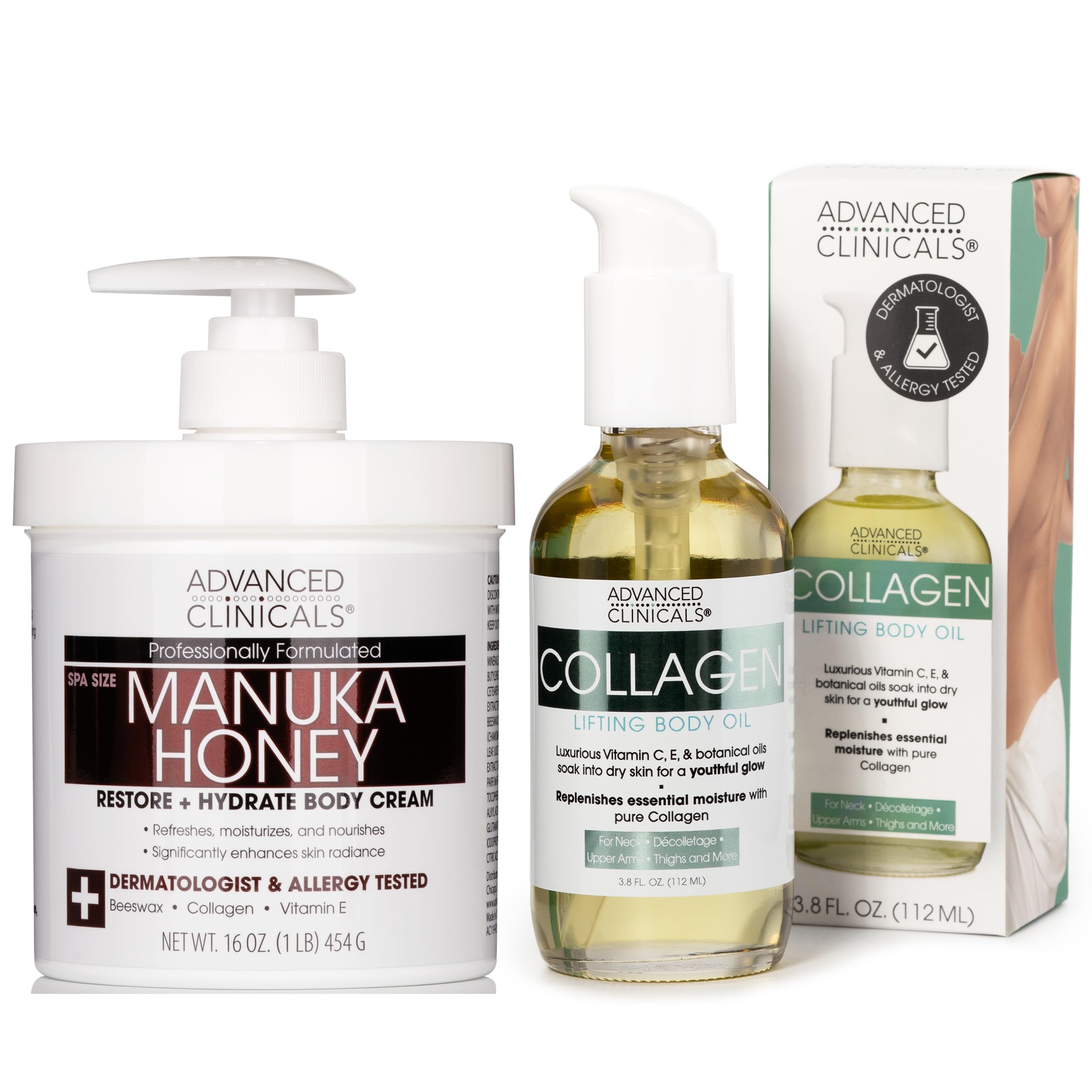 Advanced Clinicals Manuka Honey Cream is formulated to moisturize, rejuvenate, and nourish dry, aging skin. This non-greasy formula absorbs quickly for a soft, smooth feel. Our concentrated hydrating cream is infused with rare Manuka Honey from New Zealand, collagen and beeswax to instantly improve rough dry skin. Our formula is especially helpful for diminishing the look of wrinkles and discolorations due to age and dryness. Advanced Clinicals Collagen Lifting Body Oil is an indulgent body oil that soaks into the skin for a youthful glow. Pure Collagen is a naturally occurring protein found in abundance in youthful skin, making it the perfect natural moisturizer and skin-tightener. Advanced Clinicals Collagen Lifting Oil is infused with antioxidant Vitamin C Oil, Moringa Oil and Vitamin E. Silky formula absorbs quickly, leaving skin feeling velvety soft and visibly lifted. Collagen locks in moisture for a supple appearance leaving skin dramatically lifted, more hydrated, and soft to the touch. Vitamin C helps reduce visible discoloration, sagging and lost elasticity.RELAX, HYDRATE, RENEW, RESTORE – Dermatologist-Tested, Clinically-Tested, Allergy-Tested, Non-Greasy, PH Balanced Formula. Free From: Parabens, Drying Alcohols, PEGs, Sulfates, Dyes, Propylene Glycol, Talc. Manufactured in our FDA-Regulated Inspected Laboratory in Chicago, USA. We are confident that you'll love the way this Advanced Clinicals Manuka Honey Body Cream makes your skin look and feel, and we stand behind our product with a satisfaction-guarantee. NOURISHING HYDRATING – With age our skin loses elasticity moisture, our Clinically-Tested, Dermatologist-Tested, Allergy-Tested hydrating Collagen Body Oil formula visibly smooths the look of skin's rough texture, plumps overall skin tone, replenishes essential moisture to visibly restore volume to areas prone to sagging, dark spots, wrinkles. Nourish, hydrate, plump your skin for a healthier, fuller, younger appearance while also improving your skins elasticity all at once. COLLAGEN OIL – Collagen is a protein found naturally in our skin, bones, connective tissue, and it plays a critical role in maintaining our skin's elasticity firmness. As we age, our body's natural collagen production declines, which can lead to the appearance of fine lines, wrinkles, sagging skin. Advanced Clinicals Collagen body oil helps boost skin elasticity, restore collagen within your skin, and hydrate nourish your skin, leaving it feeling more soft, supple, radiant. RADIANT SKIN – Advanced Clinicals Manuka Honey Cream 3-in-1 formula moisturizes, restores, nourishes aging skin to help combat the pesky appearance of discolored skin, age spots, freckles, wrinkles, fine lines, damage from sun spots, hyperpigmentation, acne scars. Manuka Honey is rich in amino acids which exfoliates away dead skin cells, helping to keep your pores open and clear. The perfect lotion for extremely dry skin to help your skin maintain a natural, youthful glow. MANUKA HONEY – Manuka honey is a natural humectant, which means it attracts retains moisture in the skin to help hydrate moisturize dry or dehydrated skin, leaving it soft supple. Manuka honey is rich in vitamins, minerals, amino acids that help nourish skin. These nutrients help promote a healthy complexion support the skin's natural rejuvenation process. This non-greasy formula leaves skin feeling and looking great after each use.