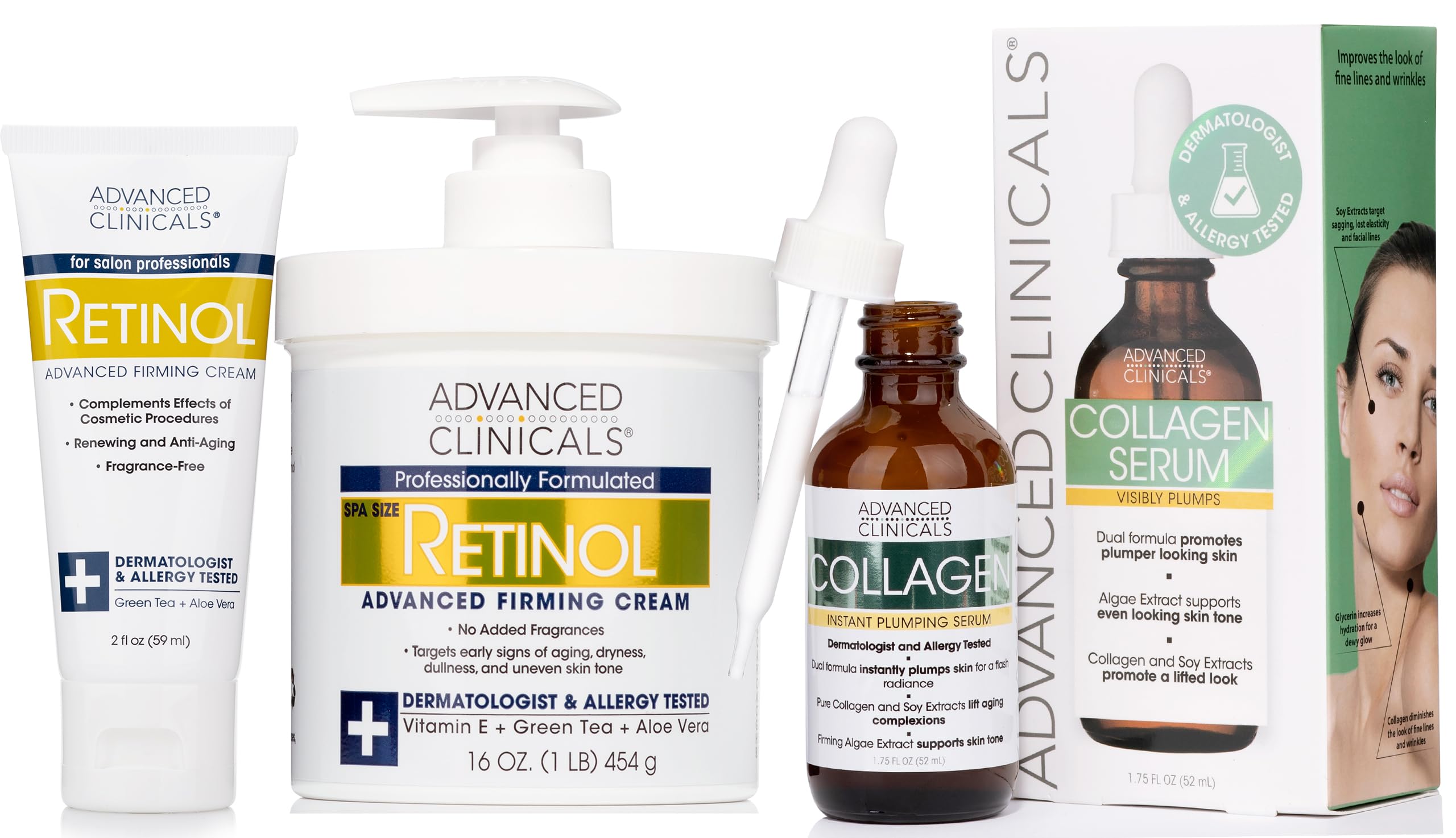 With age our skin loses elasticity moisture, this Advanced Clinicals Retinol Moisturizer Body Lotion Face Cream is the perfect combination of anti aging ingredients with natural-antioxidants to help you promote more radiant skin a more youthful look. Most retinol products come in small 2 ounce or less jars that only last a short time, but this Retinol Cream comes in a large 16-Ounce Spa Size jar and an additional 2-Ounce travel size tube. Clinically-Tested, Dermatologist-Tested, Allergy-Tested. This Non-Greasy, Fragrance Free, Retinol Advanced Firming Cream formula absorbs easily into the skin and is rich enough to be a long-lasting body moisturizer, but also gentle enough to be used as daily facial moisturizer. Formulated to be safe for all skin types. Nourish, hydrate, plump your skin for a healthier, fuller, younger appearance while also improving your skins elasticity all at once. Advanced Clinicals Collagen Serum is formulated with the perfect combination of effective anti aging skin tightening ingredients, including Vitamin C, Retinol, Vitamin E, Manuka Honey, Coconut Oil, Argan Oil, Shea Butter, More. Retinol firms skin. Shea Butter, Manuka Honey, Coconut Oil deeply moisturize skin, improve elasticity, provide a protective barrier to help prevent moisture loss. Vitamin C, Aloe Vera, Vitamin E help calm hydrate the skin. With age our skin loses elasticity moisture, our Clinically-Tested, Dermatologist-Tested, Allergy-Tested hydrating Collagen Boost Anti Aging Serum visibly smooths the look of skin's rough texture, plumps overall skin tone, replenishes essential moisture to visibly restore volume to areas prone to sagging, dark spots, wrinkles. Nourish, hydrate, plump your skin for a healthier, fuller, younger appearance while also improving your skin's elasticity all at once.RELAX RESTORE – Non-Greasy, Cruelty-Free, Fragrance-Free Formula. Free From: Parabens, Drying Alcohols, Animal-Derived Ingredients, PEGs, Sulfates, Dyes, Talc. Manufactured in our FDA-Regulated Inspected Laboratory in Chicago, USA. RETINOL BEGINNERS, please take care to test cream on a small area of skin, gradually phg into your skincare routine, working up to twice daily as tolerated. If irritation occurs, reduce frequency. If irritation persists, discontinue use. STOP THE CLOCK – Reintroduce your tired, time-worn skin to collagen. A star ingredient of your skin serum, this protein helps replenish moisture, strength, elasticity for skin that bounces back. A gentle alternative to injections that nurtures a healthy complexion. Help fade imperfections with this collagen moisturizer. Superfruits Soy extracts target dermal puffiness, age spots, dark circles, fine lines, wrinkles, crepey skin, more. COLLAGEN SERUM – Collagen is a protein found naturally in our skin, bones, connective tissue, and it plays a crucial role in maintaining our skin's structure, elasticity firmness. As we age, our body's natural collagen production declines, which can lead to the appearance of fine lines, wrinkles, sagging skin. Advanced Clinicals Collagen Serum for face helps boost skin elasticity, restore collagen within your skin, and hydrate nourish your skin, leaving it feeling more soft, supple, ra. HYDRATING NOURISHING – Advanced Clinicals Retinol Cream is infused with Aloe Vera, Chamomile, Glycerin, Green Tea, which all work together to effectively firm skin reduce the appearance of sun damaged skin, wrinkles, fine lines, crepey skin. Aloe Vera defends against visible redness irritation. Green Tea Chamomile guards against environmental damage reduces puffiness. Combination of ingredients make this Retinol Body Cream non-irritating unlike many other retinol products. 1 CLINICALLY PROVEN ANTI-AGING INGREDIENT – Vitamin A (Retinol) is considered to be the 1 Dermatologist recommended anti aging skin care ingredient. It is known to diminish the look of deep wrinkles, sagging skin, fine lines, crepey skin, sun damage while boosting collagen production to help with firming. First formulated for use after cosmetic procedures, this Retinol Cream is now available for anyone who wants to renew his or her skin.