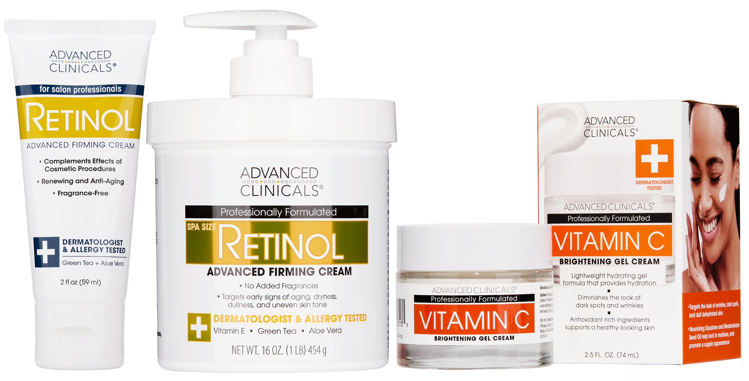 With age our skin loses elasticity moisture, this Advanced Clinicals Retinol Moisturizer Body Lotion Face Cream is the perfect combination of anti aging ingredients with natural-antioxidants to help you promote more radiant skin a more youthful look. Most retinol products come in small 2 ounce or less jars that only last a short time, but this Retinol Cream comes in a large 16-Ounce Spa Size jar and an additional 2-Ounce travel size tube. Clinically-Tested, Dermatologist-Tested, Allergy-Tested. This Non-Greasy, Fragrance Free, Retinol Advanced Firming Cream formula absorbs easily into the skin and is rich enough to be a long-lasting body moisturizer, but also gentle enough to be used as daily facial moisturizer. Formulated to be safe for all skin types. Nourish, hydrate, plump your skin for a healthier, fuller, younger appearance while also improving your skins elasticity all at once. Vitamin C and natural ingredients provide deep hydration to the skin. This Vitamin C face moisturizer for women and men is derived from a clinically proven complex, which provides both rich and restorative moisture. Effective, yet gentle moisturizer for a healthier glow. Proper care of your skin is very important for you to maintain a healthy youthful look. This Vitamin C face cream incorporates Squalene Grapeseed Oil high in Vitamin E, which boost moisturization in skin and reduces the appearance of lines and wrinkles.RELAX RESTORE – Non-Greasy, Cruelty-Free, Fragrance-Free Formula. Free From: Parabens, Drying Alcohols, Animal-Derived Ingredients, PEGs, Sulfates, Dyes, Talc. Manufactured in our FDA-Regulated Inspected Laboratory in Chicago, USA. RETINOL BEGINNERS, please take care to test cream on a small area of skin, gradually phg into your skincare routine, working up to twice daily as tolerated. If irritation occurs, reduce frequency. If irritation persists, discontinue use. REDUCES APPEARANCE OF AGE SPOTS: Refines the look of discolored skin, age spots, freckles, damage from sunspots, hyperpigmentation, acne scars. Quick absorbing cream won't dry out your skin or leave sticky residue. Great for all skin types dry, sensitive skin. Can be used as hand lotion. VITAMIN C – Incorporating a Vitamin C infused face lotion into your daily skincare routine can help to promote a more healthy, radiant, youthful-looking complexion. Vitamin C helps promote an even skin tone, while also helping stimulate collagen production to improve skin elasticity firmness. Vitamin C also helps to minimize redness or irritation in the skin, helps protect from environmental stressors like UV rays, and helps reduce the appearance of wrinkles, fine lines, sun damage. HYDRATING NOURISHING – Advanced Clinicals Retinol Cream is infused with Aloe Vera, Chamomile, Glycerin, Green Tea, which all work together to effectively firm skin reduce the appearance of sun damaged skin, wrinkles, fine lines, crepey skin. Aloe Vera defends against visible redness irritation. Green Tea Chamomile guards against environmental damage reduces puffiness. Combination of ingredients make this Retinol Body Cream non-irritating unlike many other retinol products. 1 CLINICALLY PROVEN ANTI-AGING INGREDIENT – Vitamin A (Retinol) is considered to be the 1 Dermatologist recommended anti aging skin care ingredient. It is known to diminish the look of deep wrinkles, sagging skin, fine lines, crepey skin, sun damage while boosting collagen production to help with firming. First formulated for use after cosmetic procedures, this Retinol Cream is now available for anyone who wants to renew his or her skin.