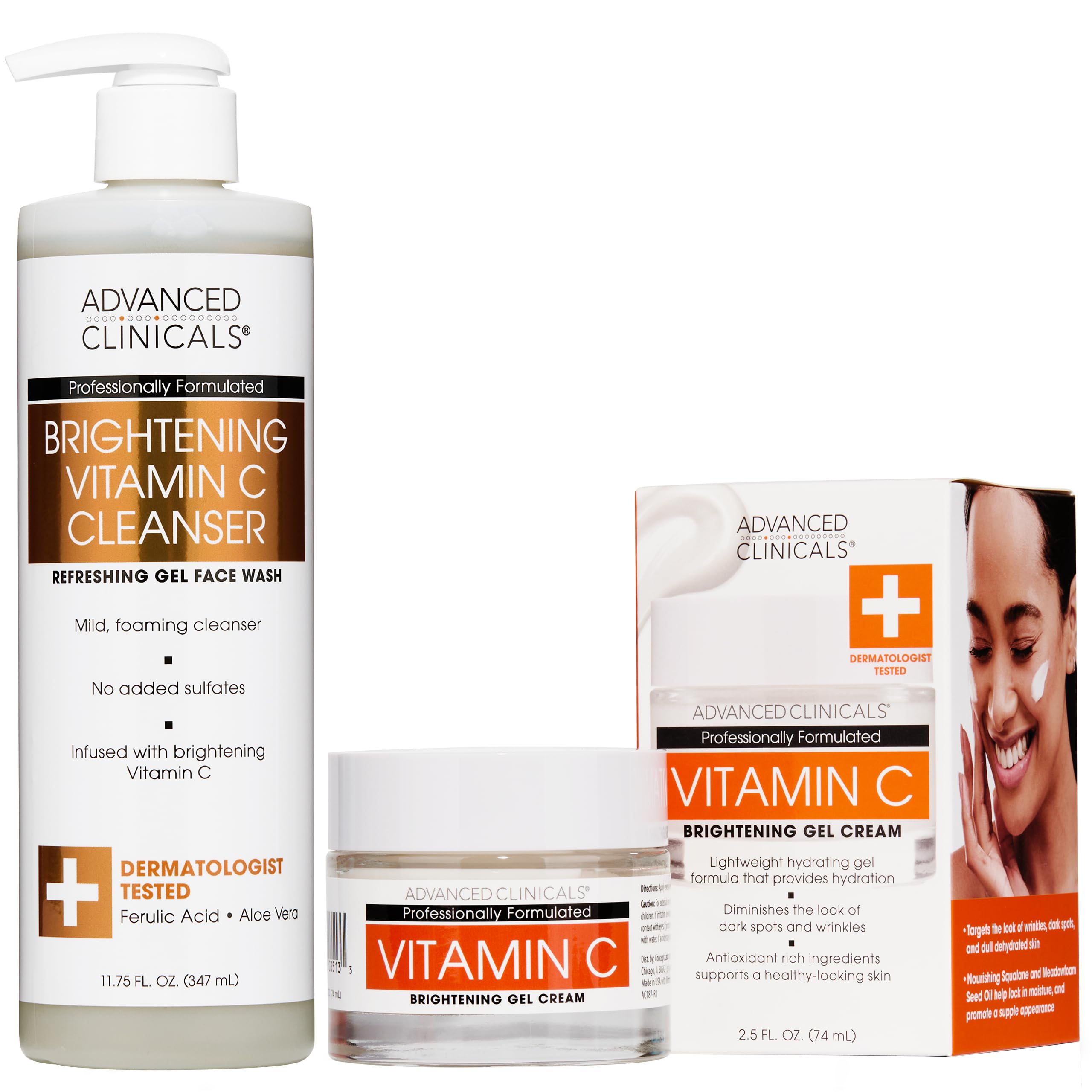 Advanced Clinicals Vitamin C Face Gel-Cream is a lightweight, hydrating gel cream. This formula diminishes the look of sun damaged skin, dark spots, and wrinkles. This product has a blend of squalane, grapeseed, and vitamin e which boosts moisturizer and encourages a healthy glow. This Vitamin C-powered gel face wash, infused with Ferulic Acid, Ginseng Root Extract, and Aloe Vera, gently cleanses while helping to hydrate and minimize dark spots. The rich lather lifts away dirt without stripping skin, leaving it refreshed, hydrated, and radiant.ADVANCED CLINICALS: Our mission is to provide our customers with affordable and effective skin and hair care. Manufactured in our cGMP MoCRA compliant facility in Chicago, USA. Dermatologist-Tested, Clinically-Tested, Allergy-Tested. Not Tested On Animals (Cruelty Free). Paraben Free, Alcohol Free, Phthalate Free, Synthetic Fragrance Free. TARGETED INGREDIENTS FOR CLEAN, REVITALIZED SKIN – Powered by Vitamin C, Ferulic Acid, Ginseng Root Extract, and Aloe Vera, this facial cleanser works to gently cleanse without stripping the skin, leaving it feeling refreshed, radiant, and hydrated. GENTLY CLEANSES AND REVITALIZES – This Vitamin C-powered gel face wash for women and men works as a hydrating facial cleanser that gently cleanses while helping to illuminate and promote an even complexion. The rich lather lifts away dirt and impurities without stripping skin. REDUCES APPEARANCE OF AGE SPOTS: Refines the look of discolored skin, age spots, freckles, damage from sunspots, hyperpigmentation, acne scars. Quick absorbing cream won't dry out your skin or leave sticky residue. Great for all skin types dry, sensitive skin. Can be used as hand lotion. VITAMIN C – Incorporating a Vitamin C infused face lotion into your daily skincare routine can help to promote a more healthy, radiant, youthful-looking complexion. Vitamin C helps promote an even skin tone, while also helping stimulate collagen production to improve skin elasticity firmness. Vitamin C also helps to minimize redness or irritation in the skin, helps protect from environmental stressors like UV rays, and helps reduce the appearance of wrinkles, fine lines, sun damage.