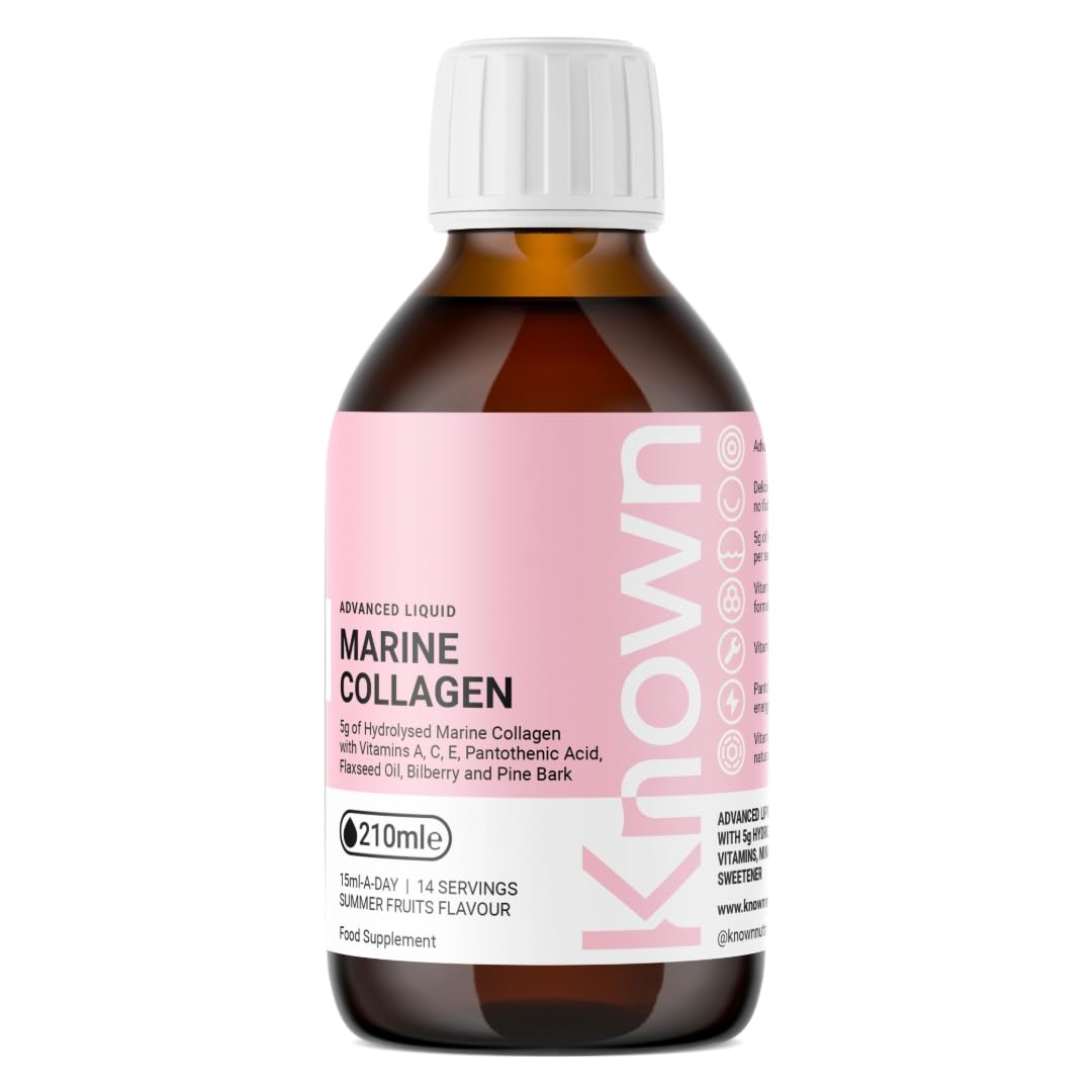 "Discover the benefits of Known Nutrition's Advanced Hydrolyzed Marine Collagen, a premium supplement containing 5000mg of hydrolyzed marine collagen per serving to complement your daily wellness routine. Formulated with vitamins A, C, and E, this unique blend supports skin health, with vitamin C contributing to normal collagen formation and vitamin E helping to protect cells from oxidative stress (EFSA). Our formula also includes pine bark and bilberry, plus flaxseed oil and liposomal technology. With a refreshing summer fruit flavor, this liquid supplement is free from artificial flavors and colors, and is also suitable for Halal diets. Manufactured in the UK to the highest standards, BRC certified, Known Nutrition is dedicated to providing safe and effective supplements to support your health."HALAL FRIENDLY, NATURAL FLAVOR – Enjoy the delicious flavor of summer fruits in a Halal-friendly formula, with no artificial flavors or colors. REFRESHING SUMMER FRUIT FLAVOR – Enjoy a delicious summer fruit flavor without artificial colors or flavors, for a pleasant daily well-being. ANTIOXIDANT PROTECTION – With natural extracts of pine bark and blueberry, as well as vitamin E, which contributes to the protection of cells from oxidative stress (EFSA). ESSENTIAL VITAMINS FOR SKIN AND IMMUNITY – Contains vitamins A, C and E. Vitamin A supports the maintenance of normal skin, while vitamin C supports normal collagen formation and immune function (EFSA). HYDROLYZED MARINE COLLAGEN – Each 15ml serving provides 5000mg of hydrolyzed marine collagen, designed for convenient daily use in liquid form. "Découvrez les bienfaits du Collagène Marin Hydrolysé Avancé de Known Nutrition, un supplément premium contenant 5000mg de collagène marin hydrolysé par portion pour compléter votre routine quotidienne de bien-être. Formulé avec des vitamines A, C et E, ce mélange unique soutient la santé de la peau, avec la vitamine C qui contribue à la formation normale de collagène et la vitamine E qui aide à protéger les cellules contre le stress oxydatif (EFSA).Notre formule inclut également de l'écorce de pin et de la myrtille, ainsi que de l'huile de lin et la technologie liposomale. Avec une saveur rafraîchissante de fruits d'été, ce supplément liquide est exempt de saveurs et de colorants artificiels, et convient également aux régimes Halal. Fabriqué au Royaume-Uni selon les normes les plus élevées, certifié BRC, Known Nutrition est dédié à fournir des suppléments sûrs et efficaces pour soutenir votre santé."CONVIENT AUX RÉGIMES HALAL, SAVEUR NATURELLE – Appréciez la délicieuse saveur de fruits d'été dans une formule adaptée aux régimes Halal, sans arômes ni colorants artificiels. SAVEUR RAFRAÎCHISSANTE DE FRUITS D'ÉTÉ – Profitez d'une délicieuse saveur de fruits d'été sans colorants ni arômes artificiels, pour un bien-être quotidien agréable. PROTECTION ANTIOXYDANTE – Avec des extraits naturels d'écorce de pin et de myrtille, ainsi que de la vitamine E, qui contribue à la protection des cellules contre le stress oxydatif (EFSA). VITAMINES ESSENTIELLES POUR LA PEAU ET L'IMMUNITÉ – Contient des vitamines A, C et E. La vitamine A soutient le maintien d'une peau normale, tandis que la vitamine C soutient la formation normale de collagène et la fonction immunitaire (EFSA). COLLAGÈNE MARIN HYDROLYSÉ – Chaque portion de 15ml fournit 5000mg de collagène marin hydrolysé, conçu pour une utilisation quotidienne pratique sous forme liquide.