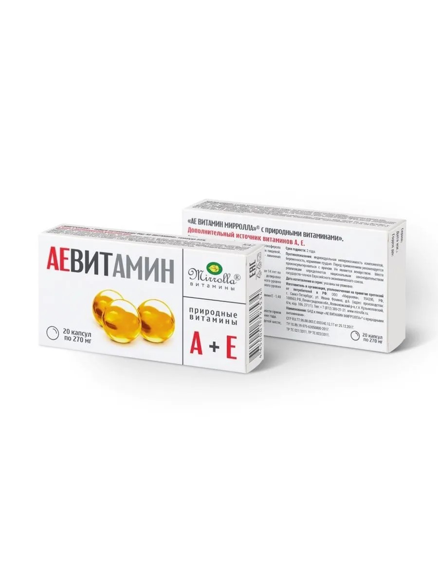 AE vitamin mirrolla with natural vitamins n20 capsules 270 mg. An additional source of vitamins A, E. As a biologically active food supplement. Vegetable oil, alpha-tocopherol acetate, retinyl palmitate, capsule shell: edible gelatin, humectant - glycerin, antioxidant - citric acid. For sale to the population as a biologically active food supplement - an additional source of vitamins A, E. (hereinafter according to the appendix). Biologically active components, the content of vitamin A in 1 capsule is not less than 0.15 mg, in liquid form - not less than 0.012%. The content of vitamin E in capsules is not less than 4.0 mg, in liquid form - not less than 0.32%. -