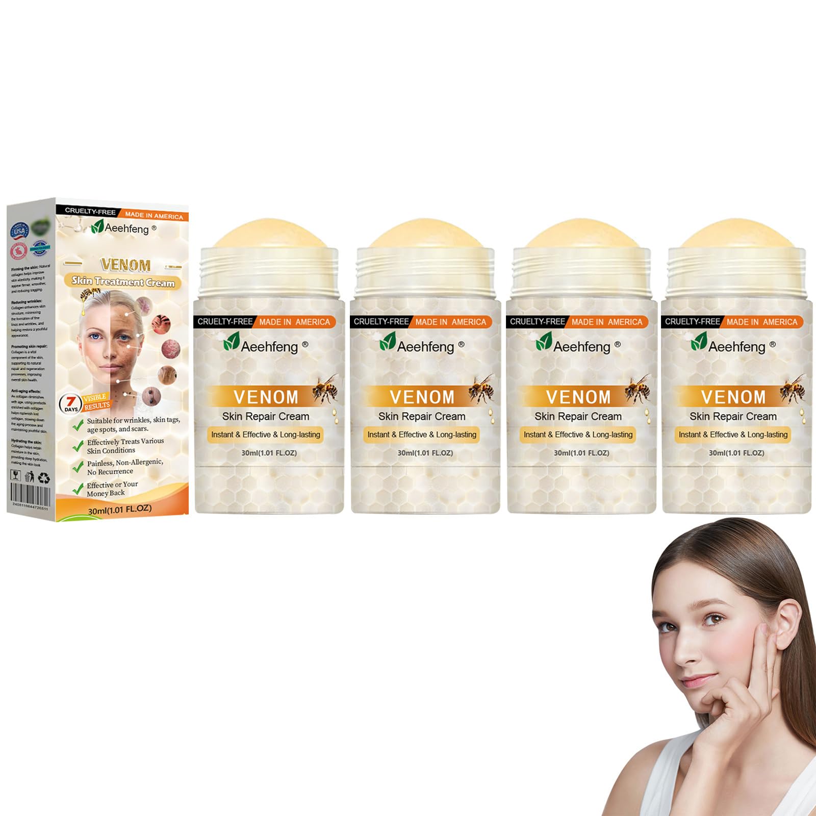 AEEHFENG Bee Venom Skin Repair Cream Advanced Bee Venom Firming Serum Stick Firming & Wrinkle-Reducing Cream Hydrating Natural Ingredients Suitable for All Skin Types (4 Bottle)